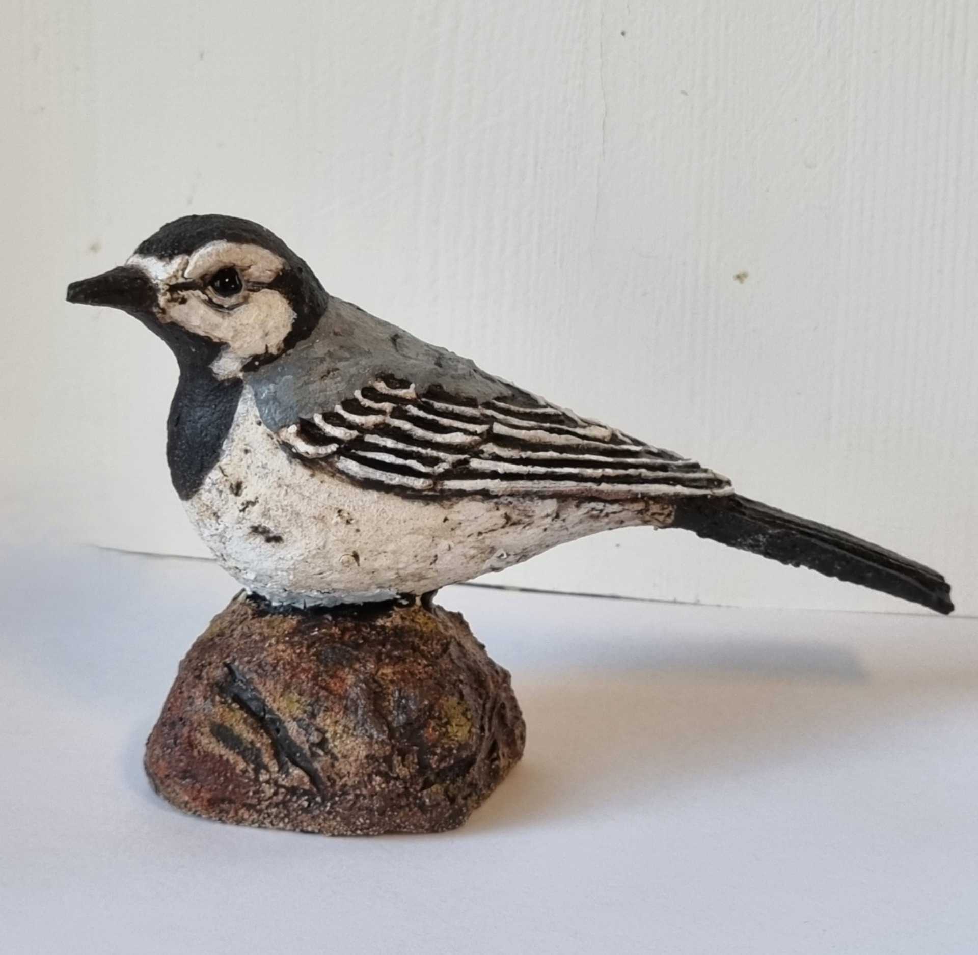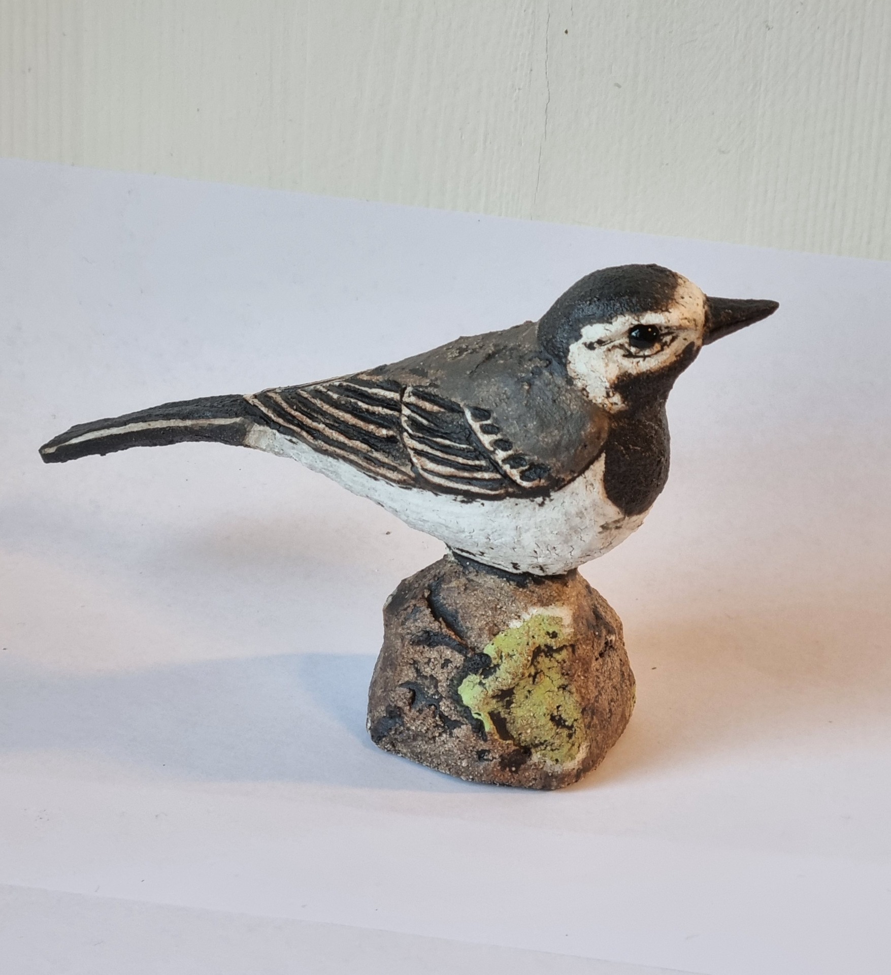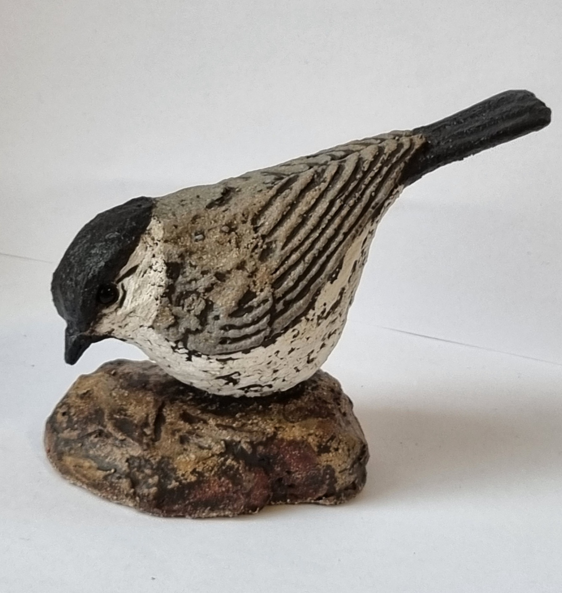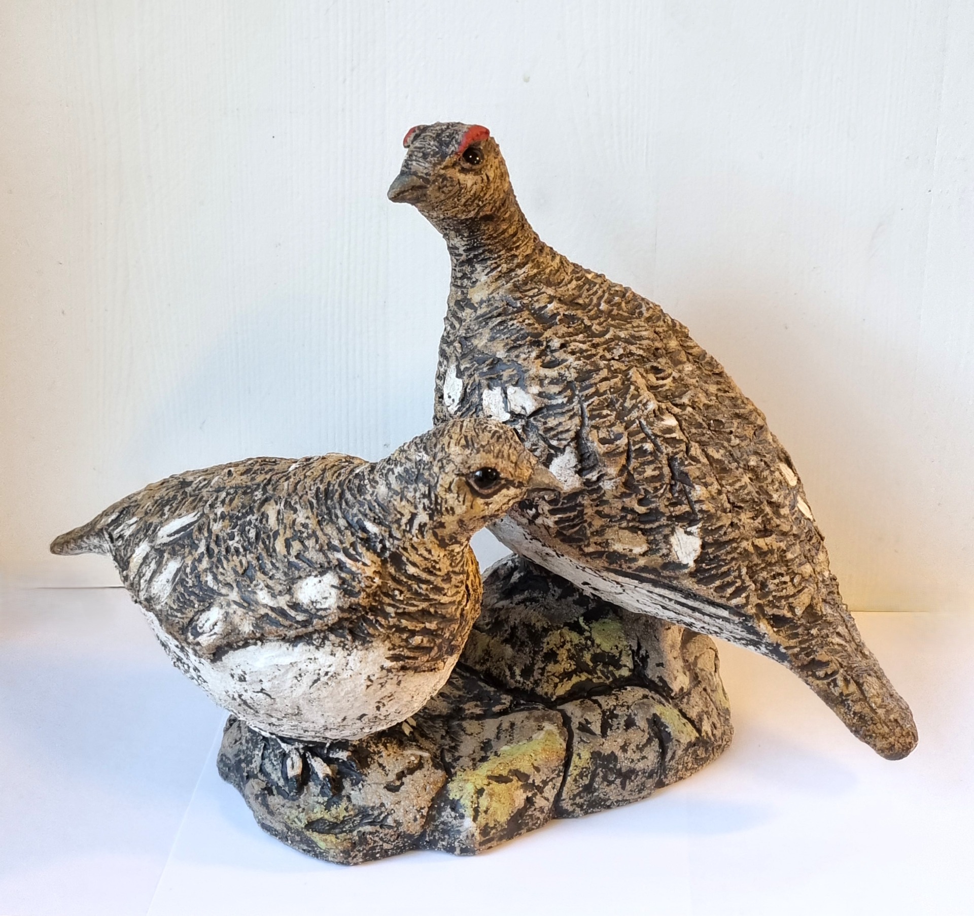 Unike håndlagede fugler i grov keramikk. Sokkel i tre eller keramikk. Kan henge /stå inne eller utendørs. Selges ikke engros.