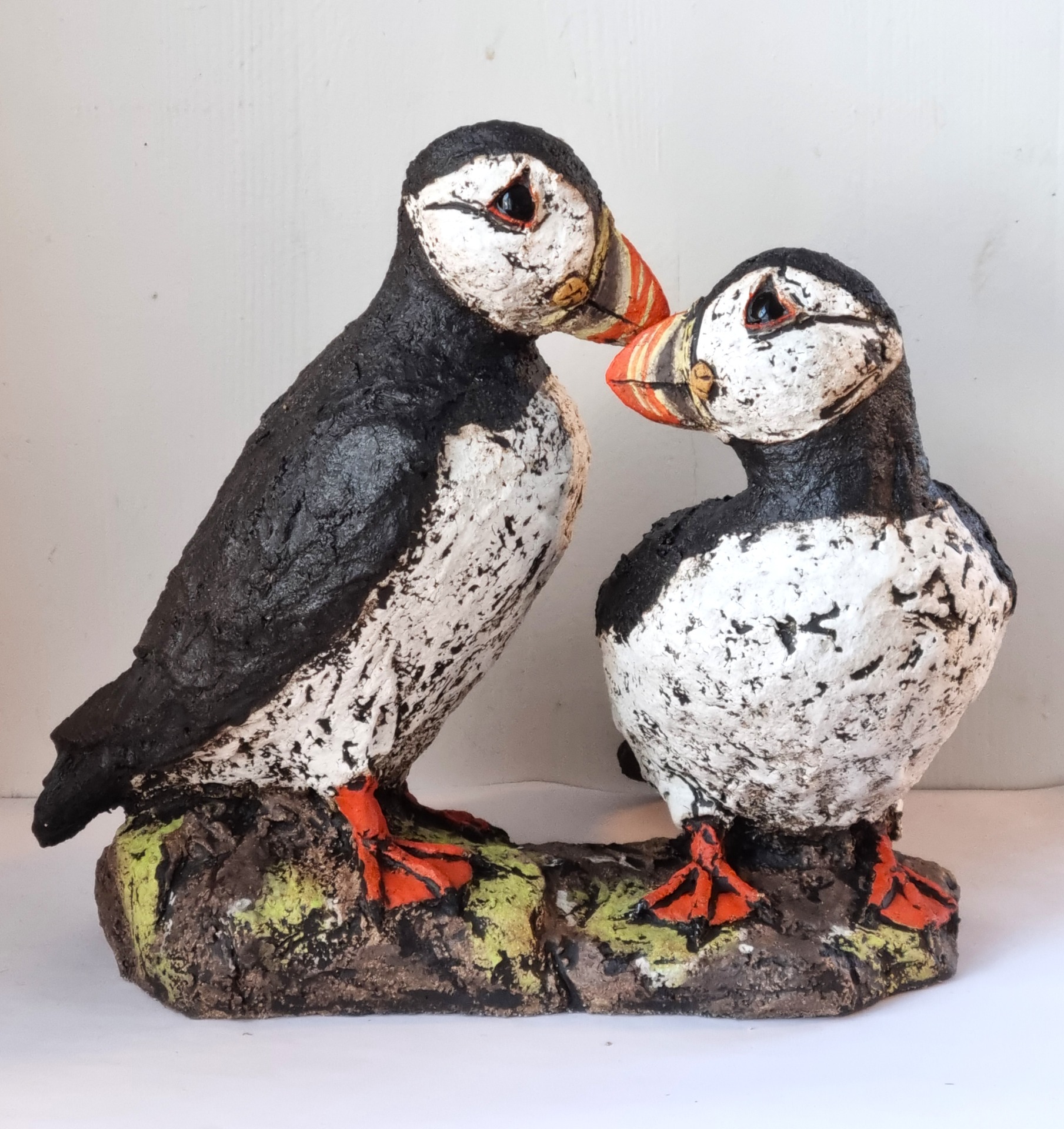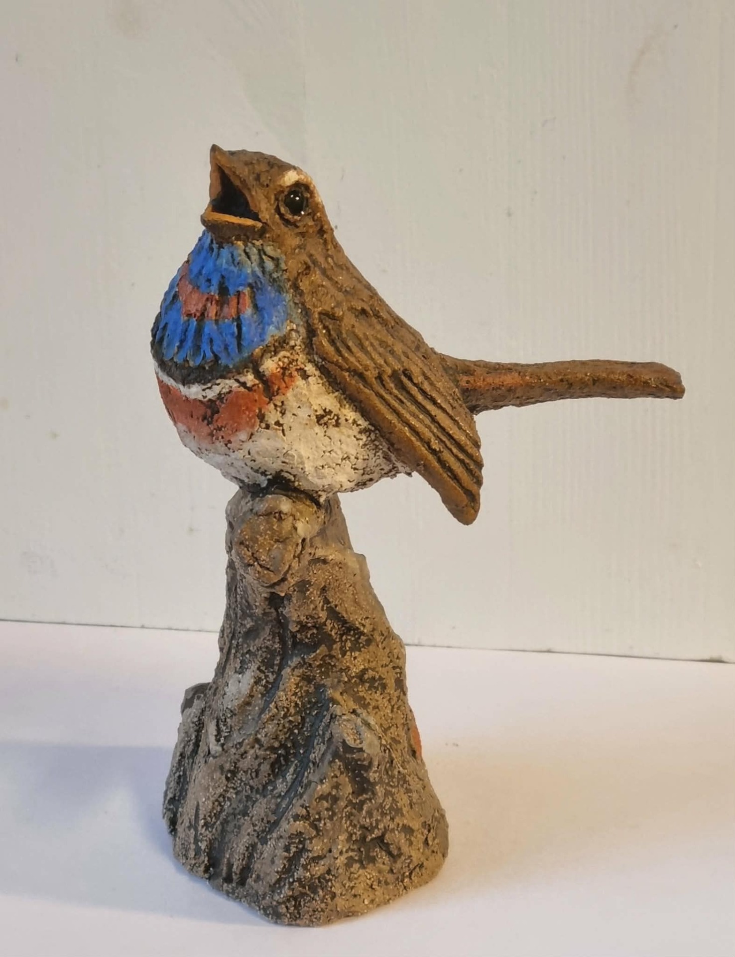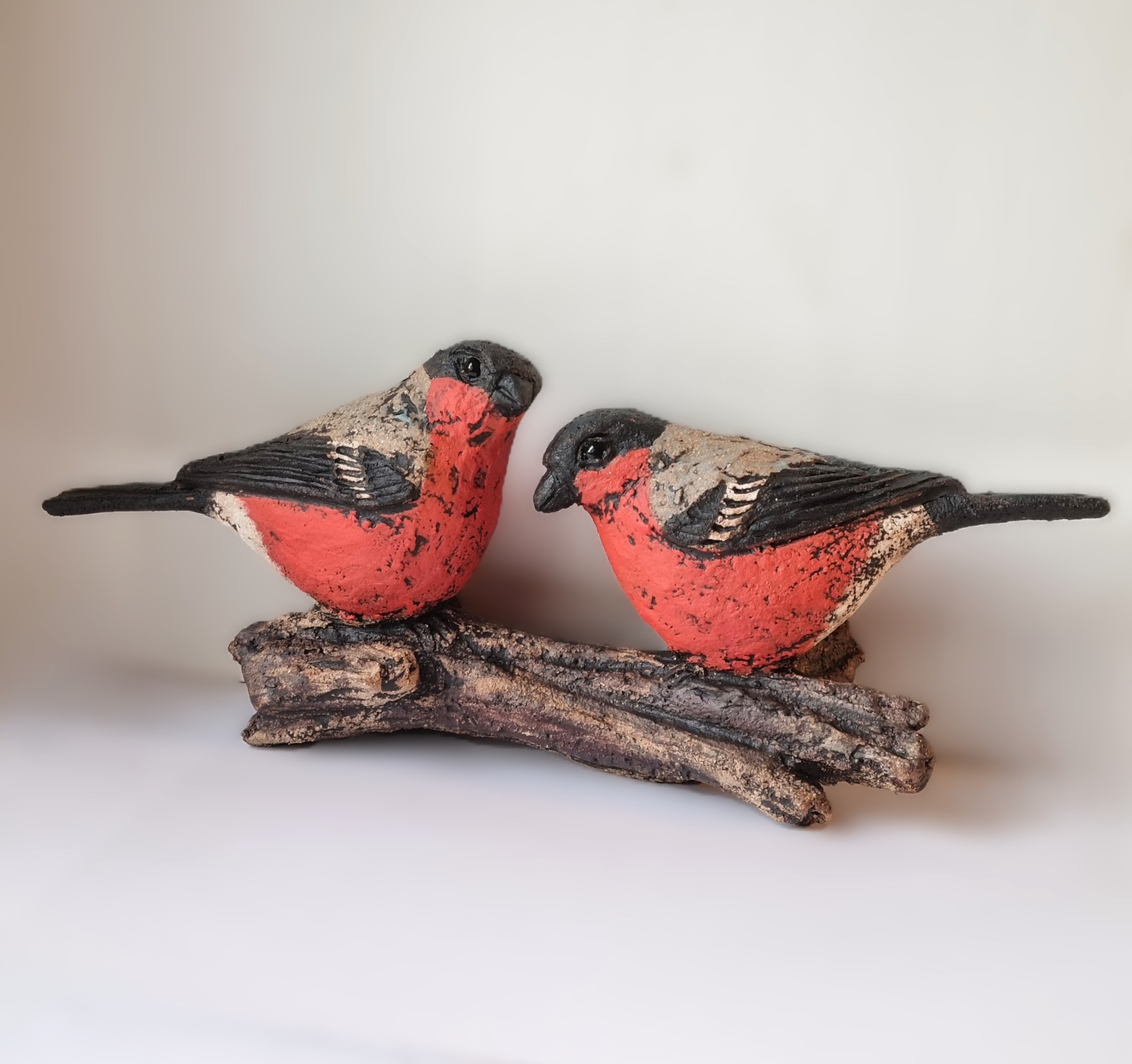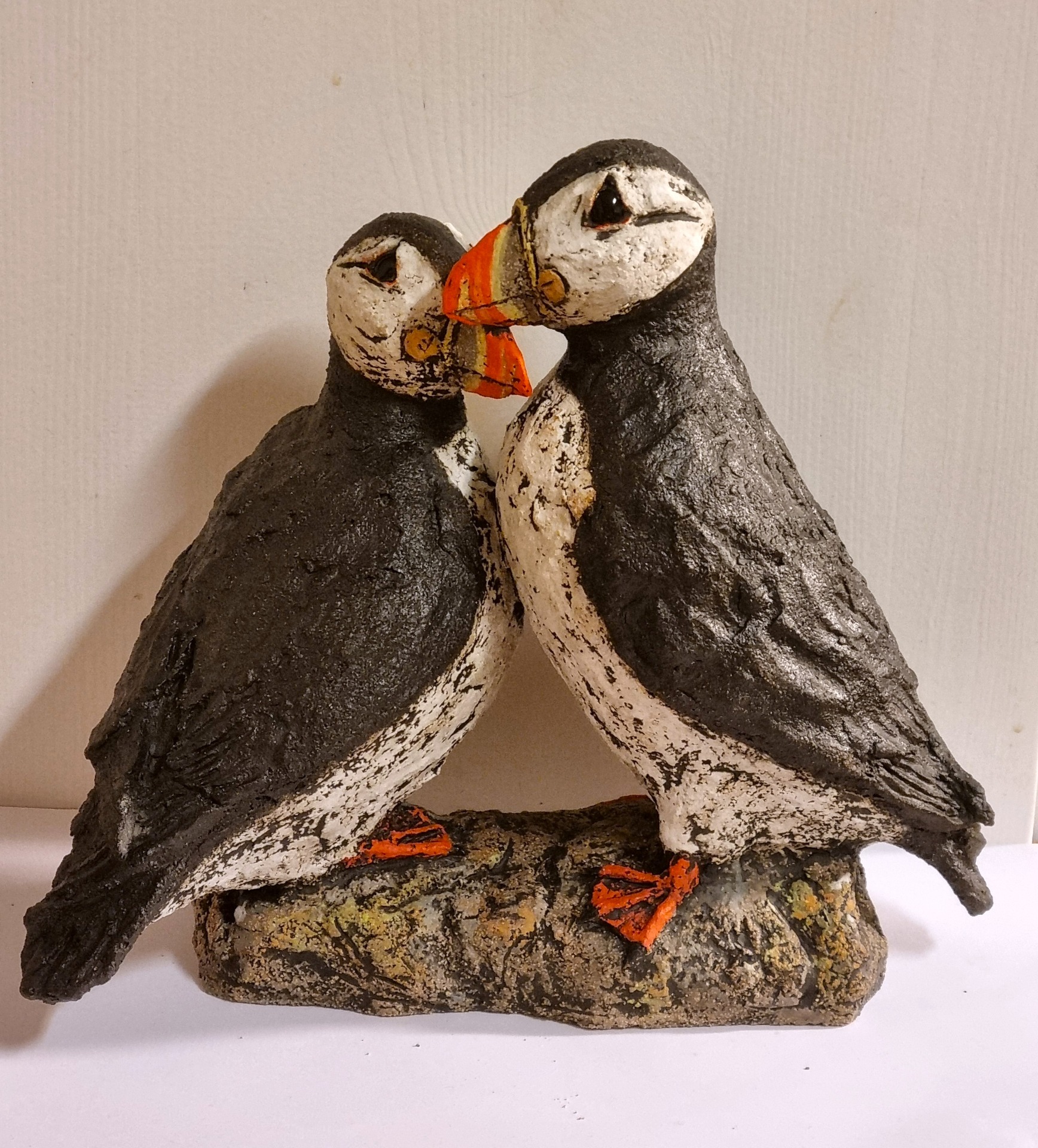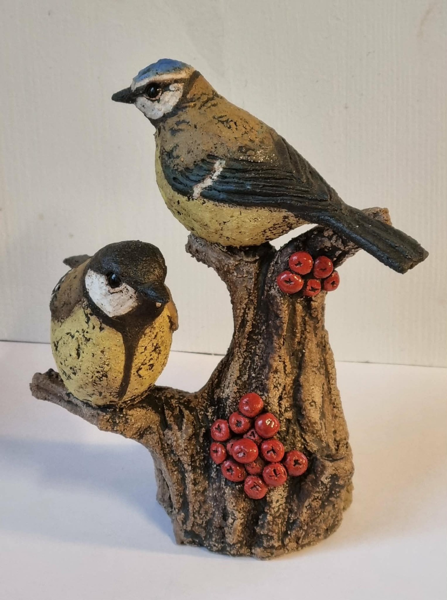 Unike håndlagede fugler i grov keramikk. Sokkel i tre eller keramikk. Kan henge /stå inne eller utendørs. Selges ikke engros.