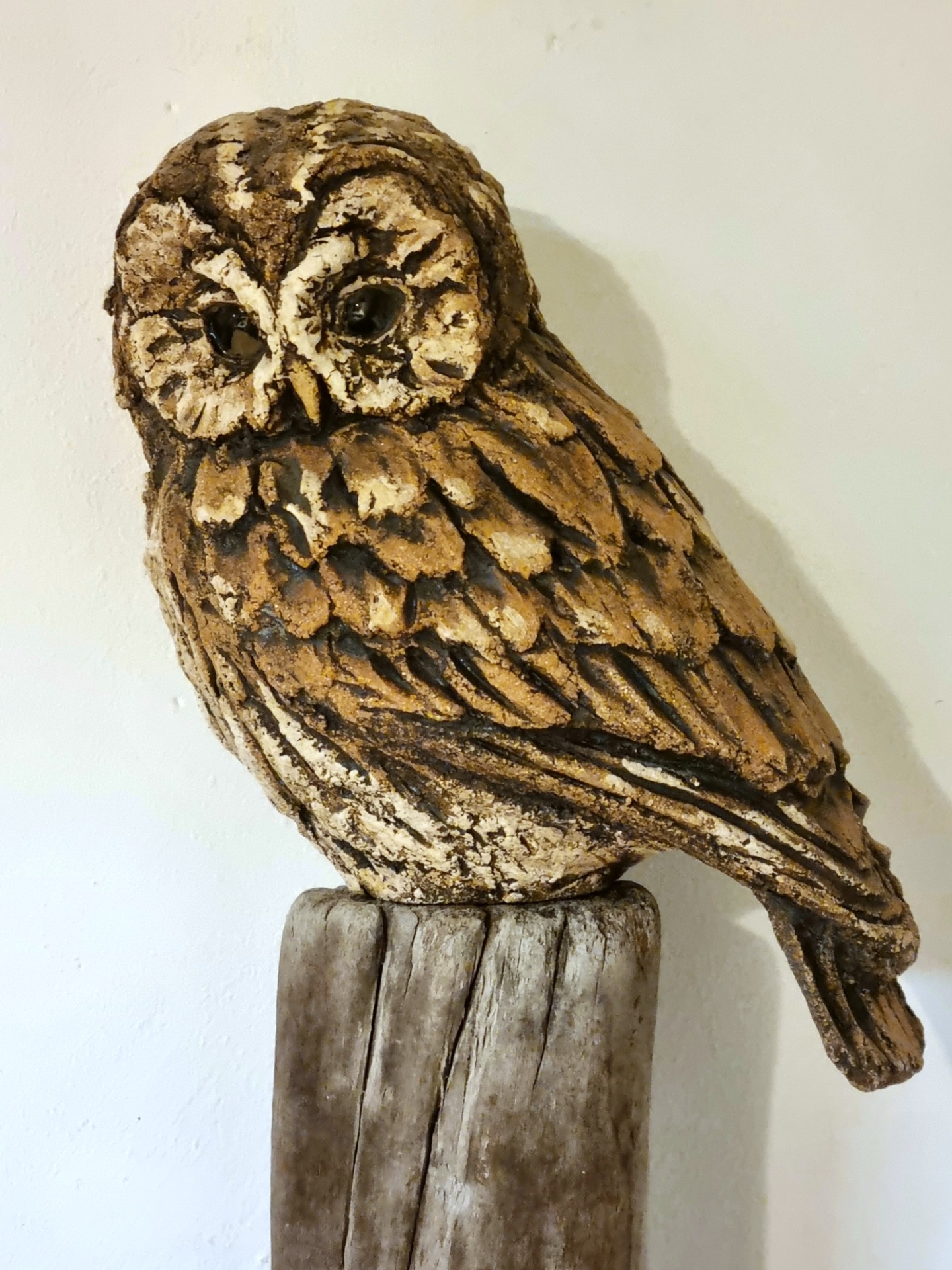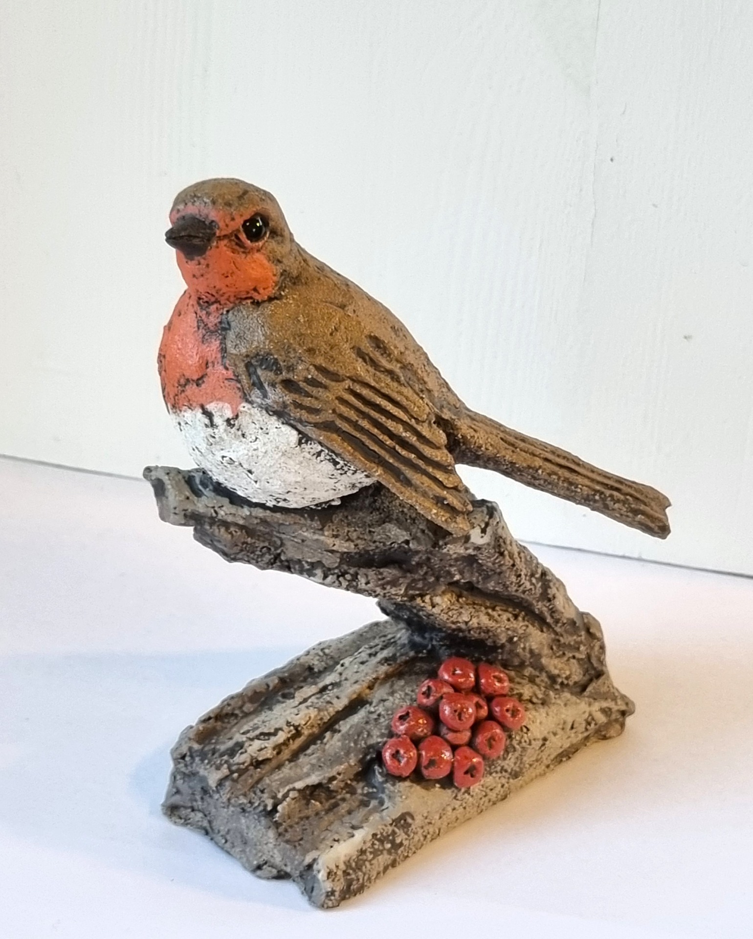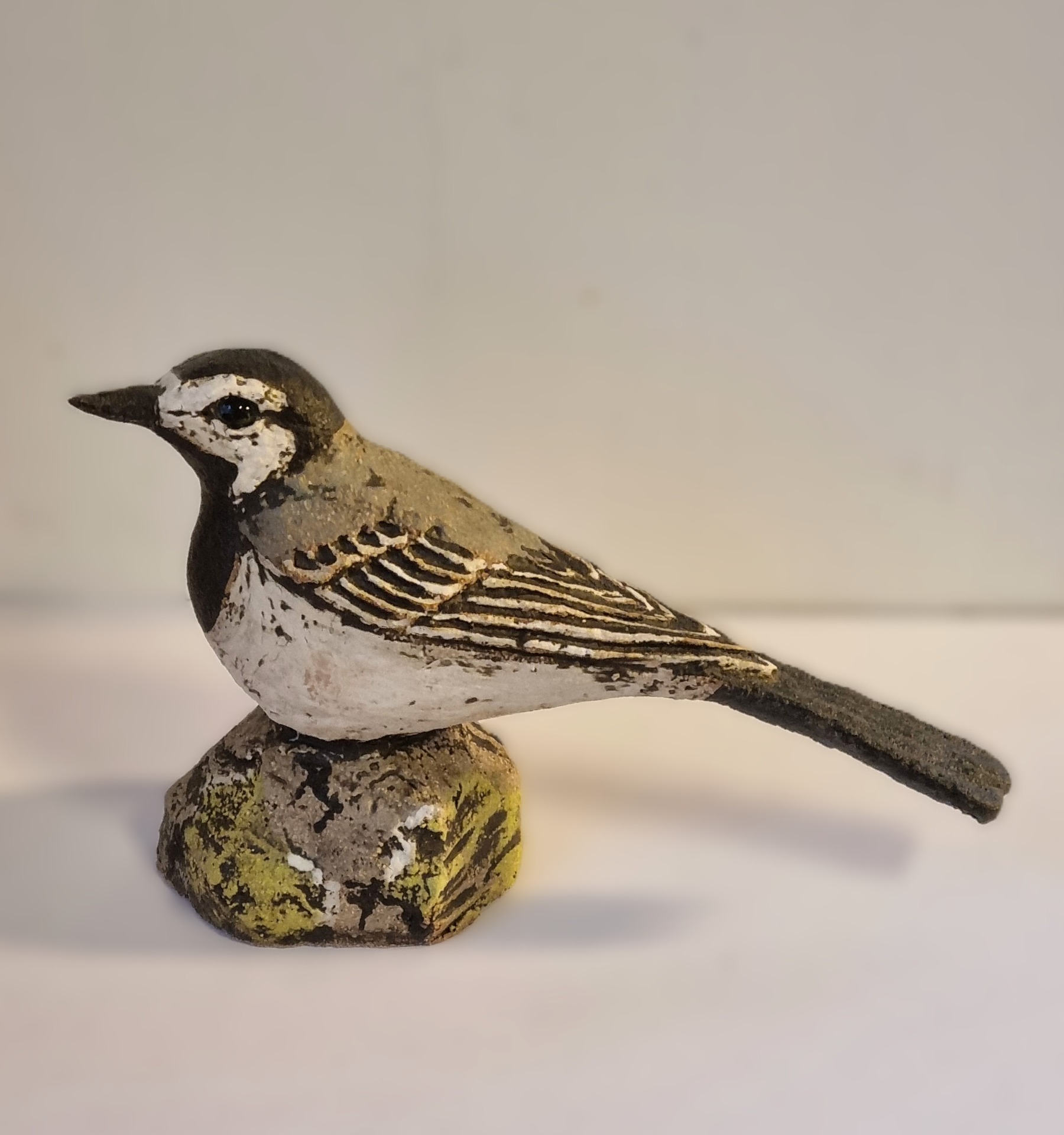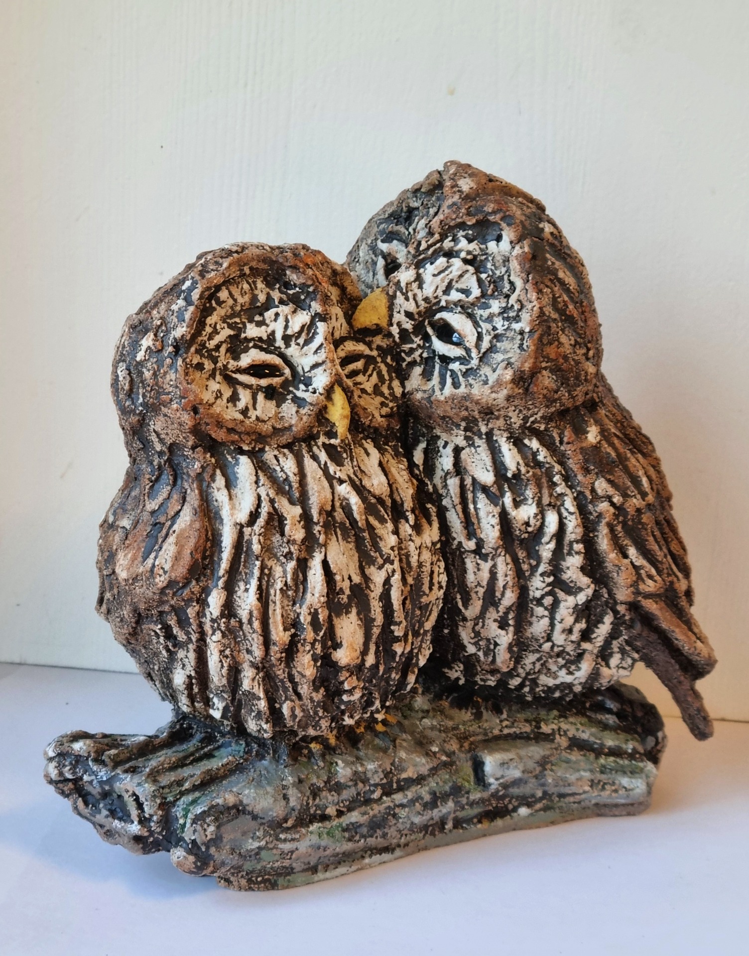 Unike håndlagede fugler i grov keramikk. Sokkel i tre eller keramikk. Kan henge /stå inne eller utendørs. Selges ikke engros.