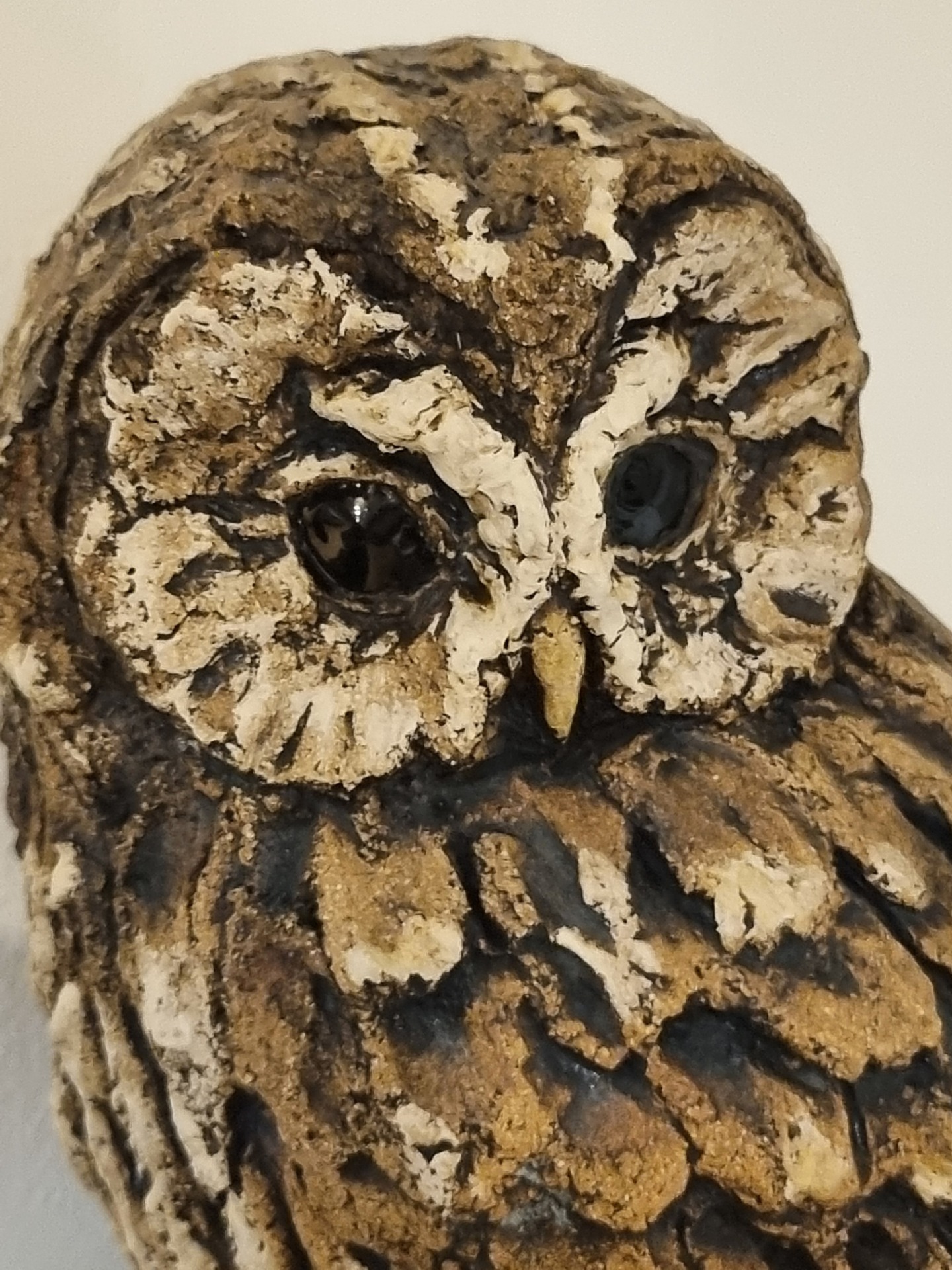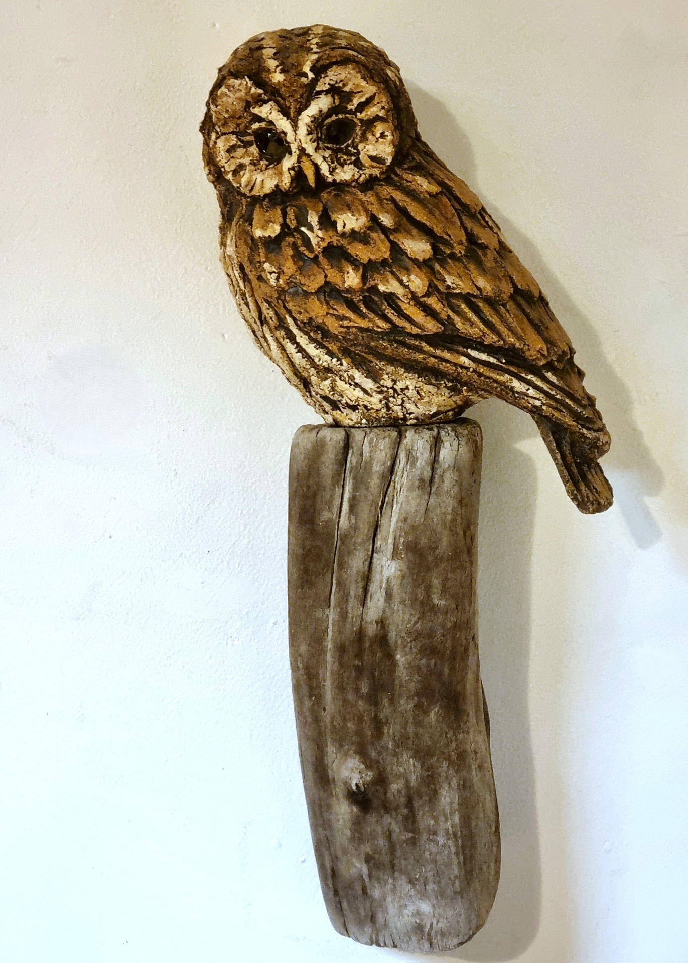 Kattugle hånd laget i grov keramikk. Står på en trestokk. Kattugle 25 cm , med sokkel 38 cm.