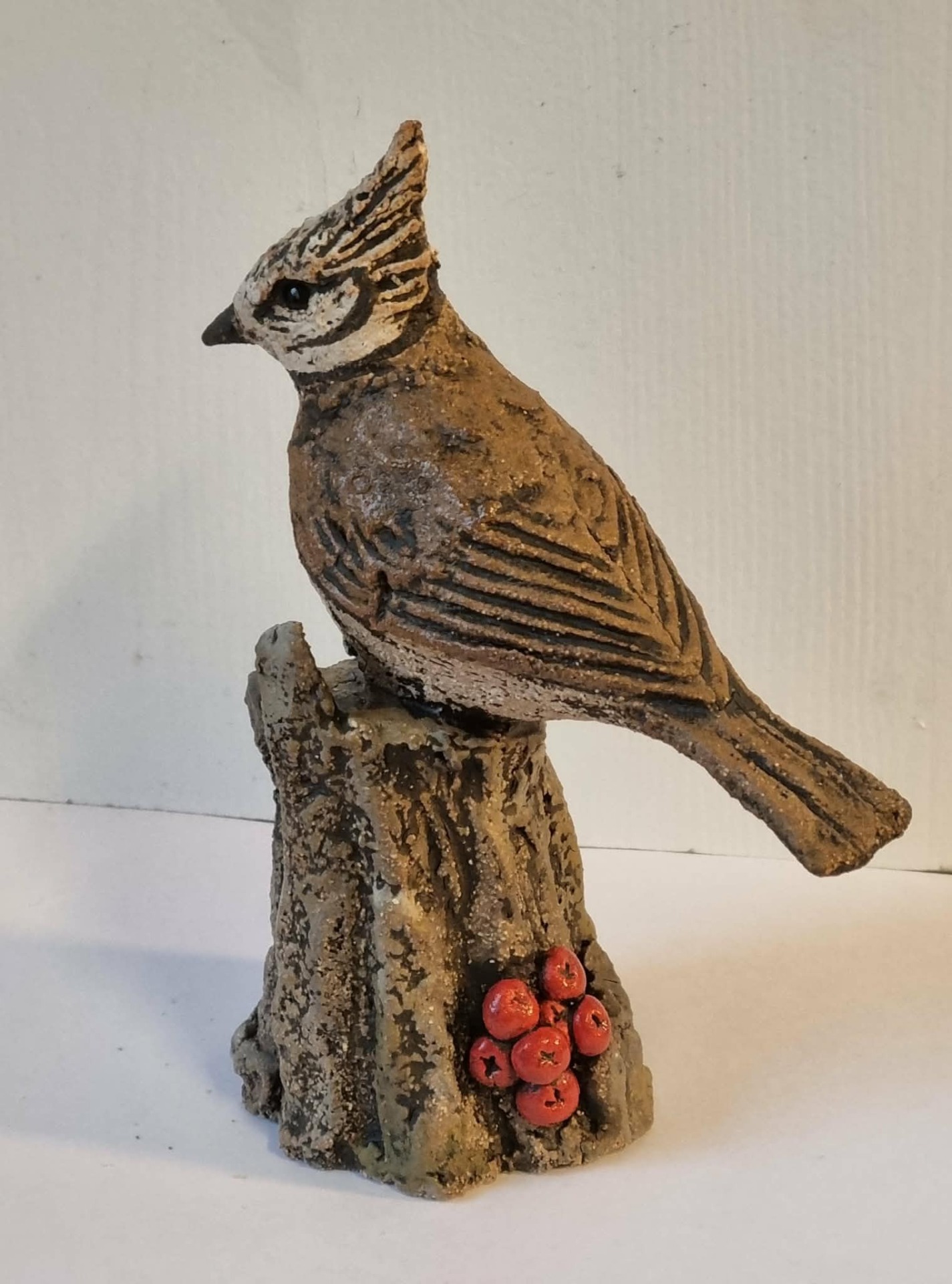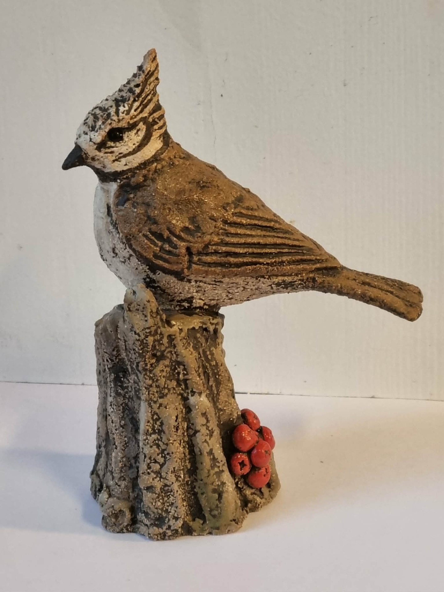 Toppmeis håndlaget i grov keramikk. Høyde 14cm ,lengde fugl 13 cm. Bredde 6 cm