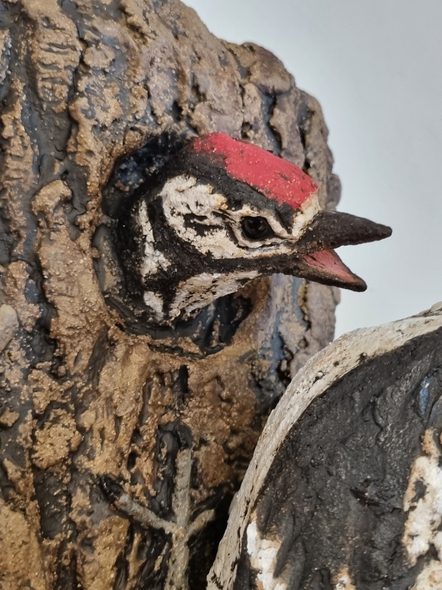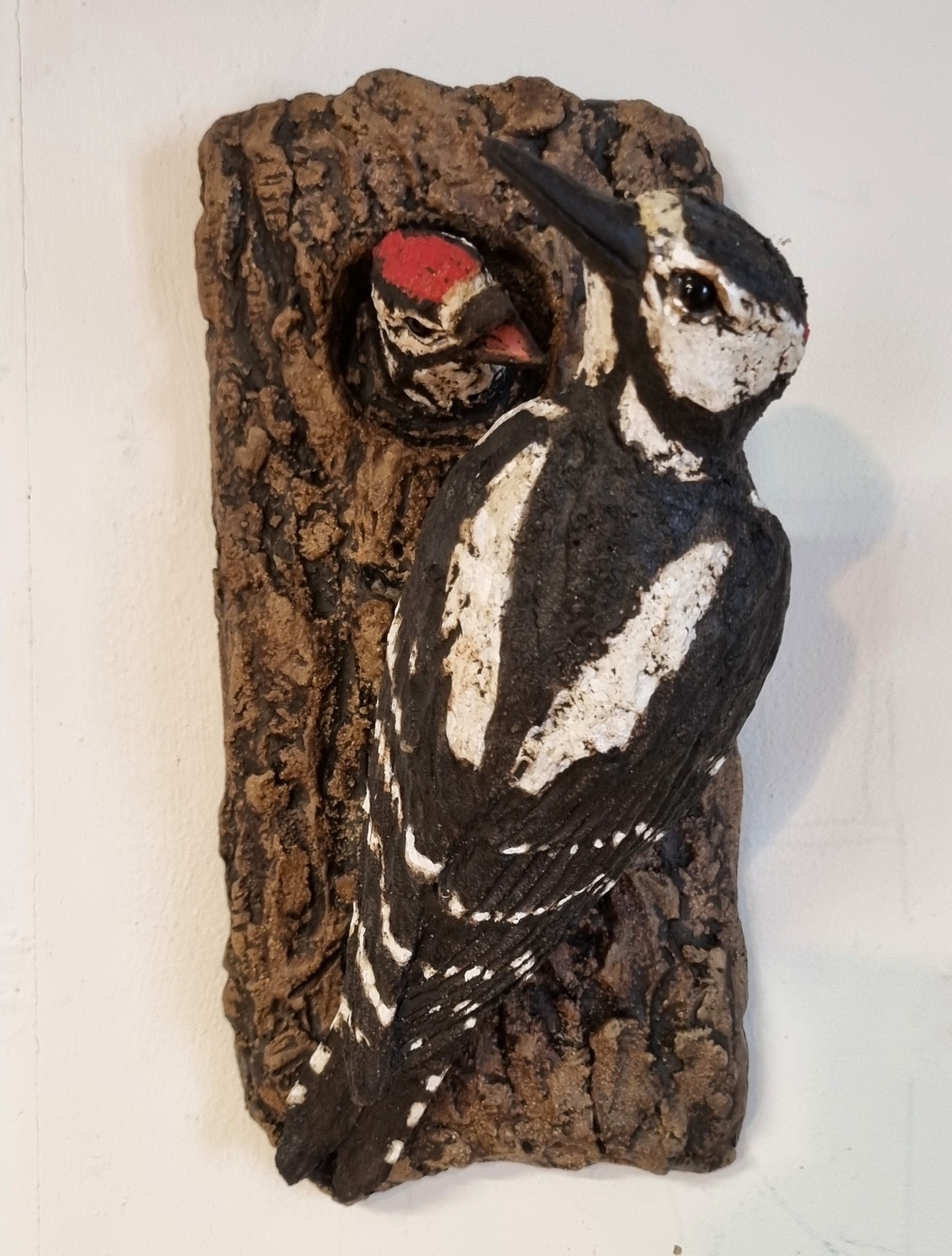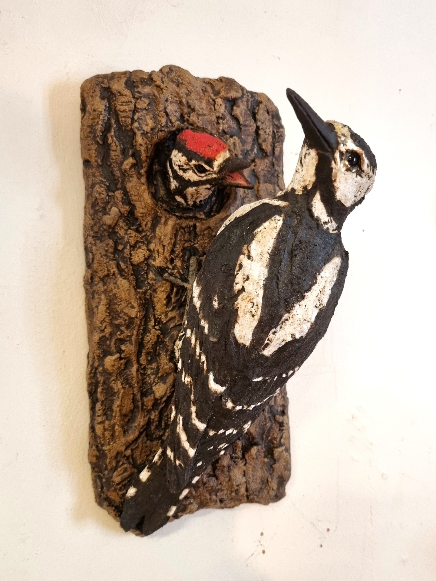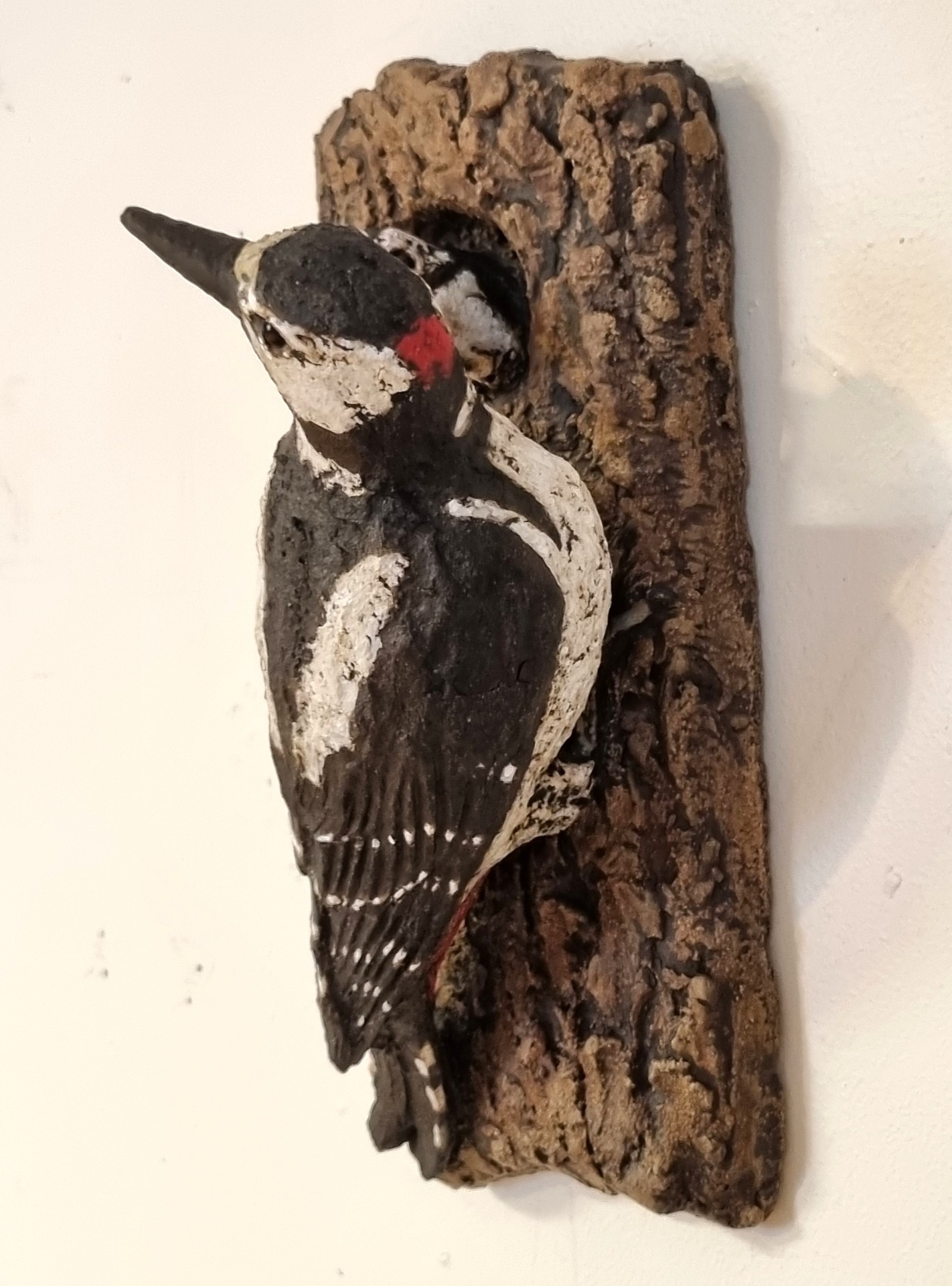 Flaggspett håndlaget i grov keramikk. Henges på vegg.