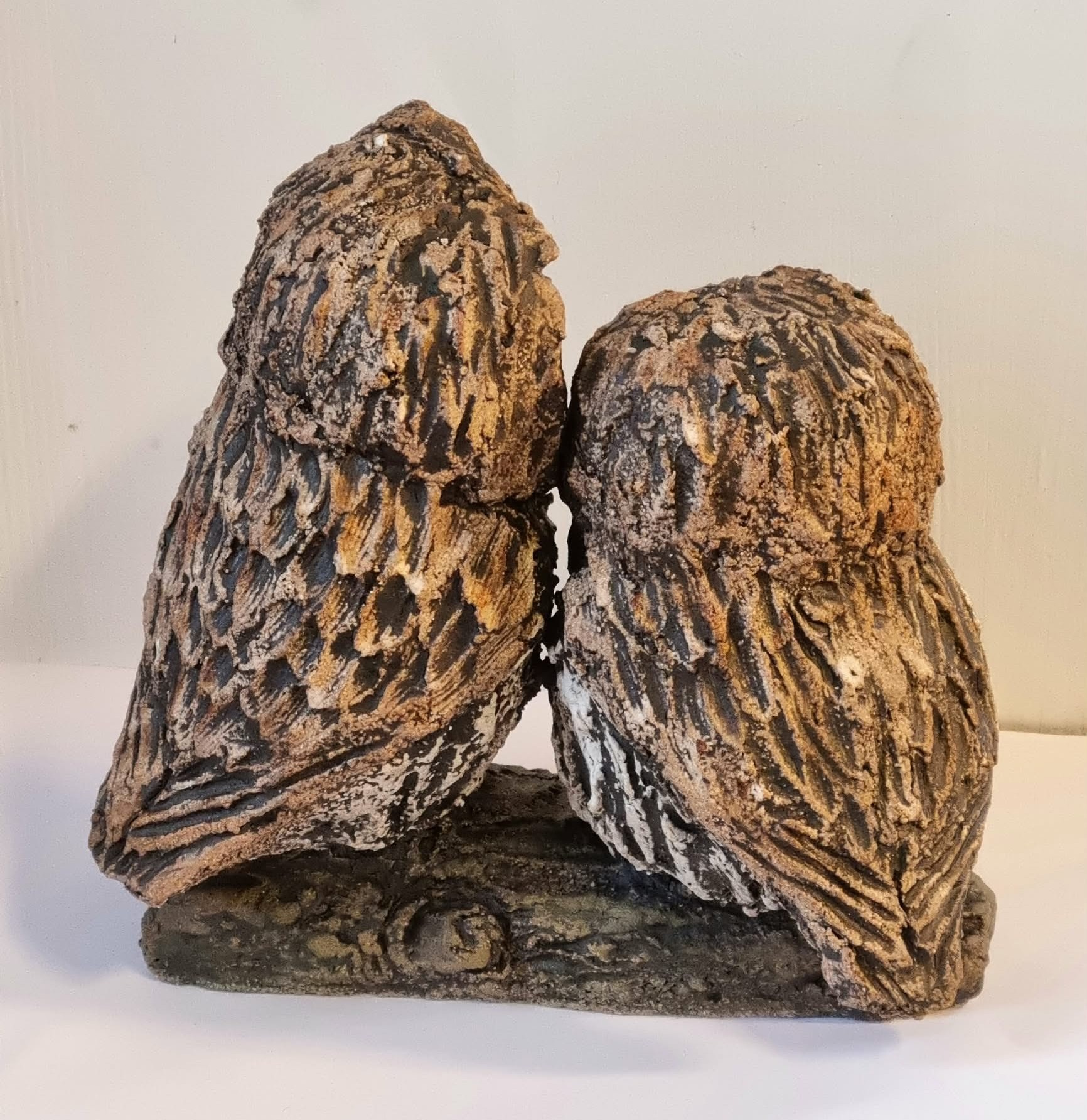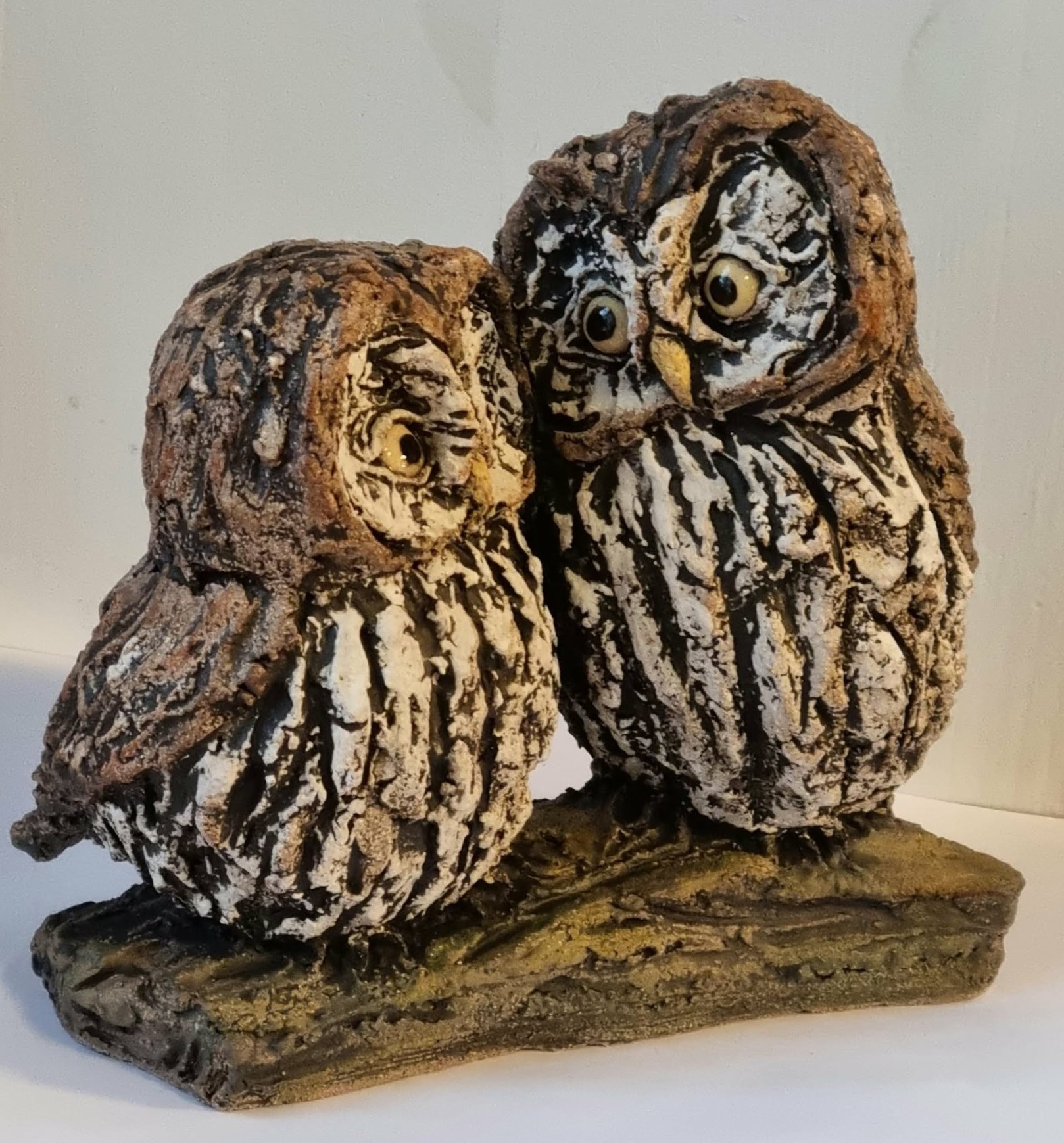 Ugleunger laget i grov leire. Størrelse Høyde 15 cm, Bredde 9 cm, Lengde 16 cm.