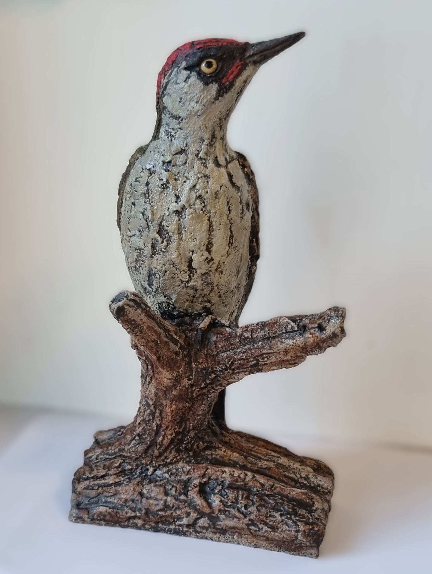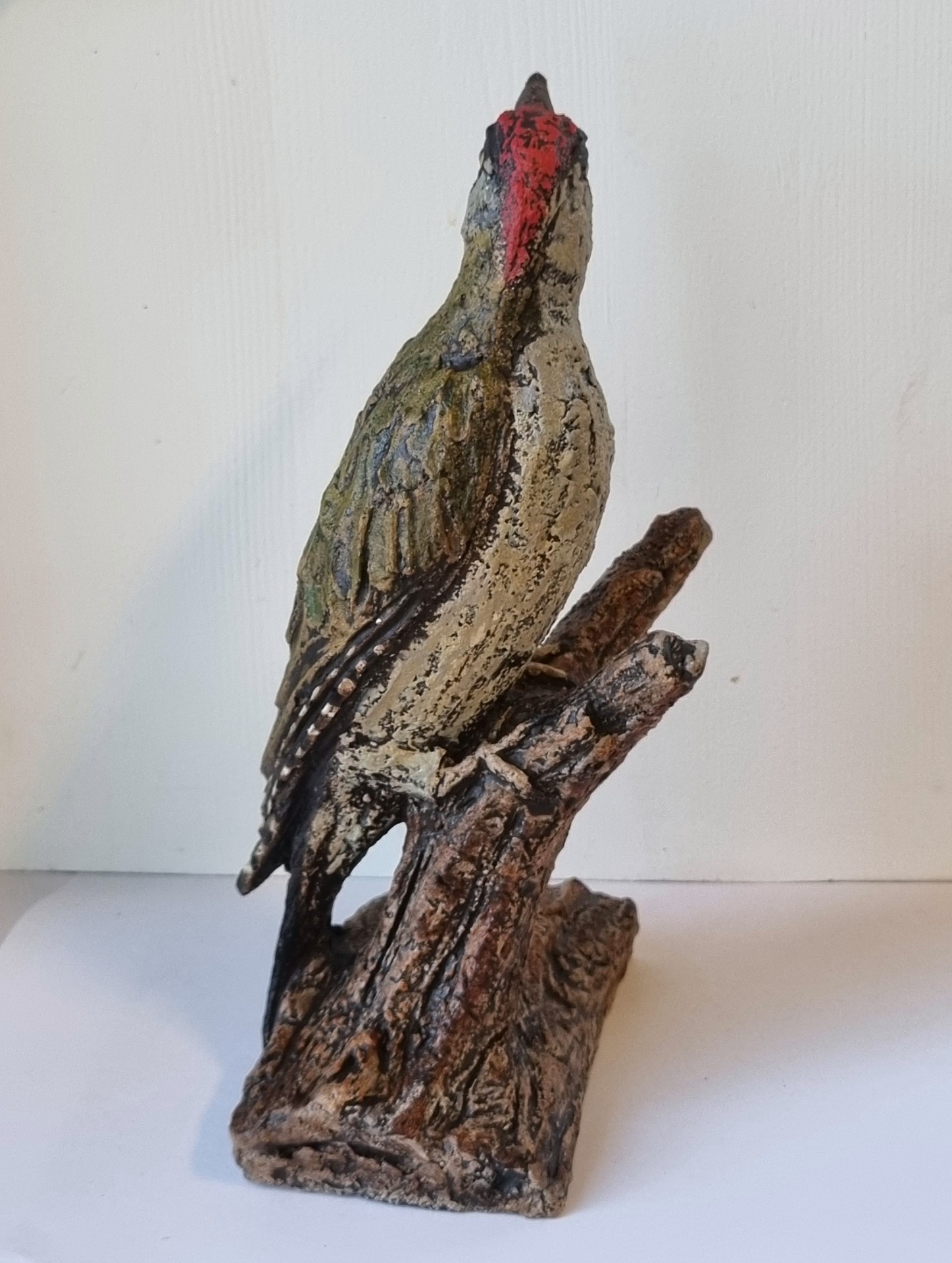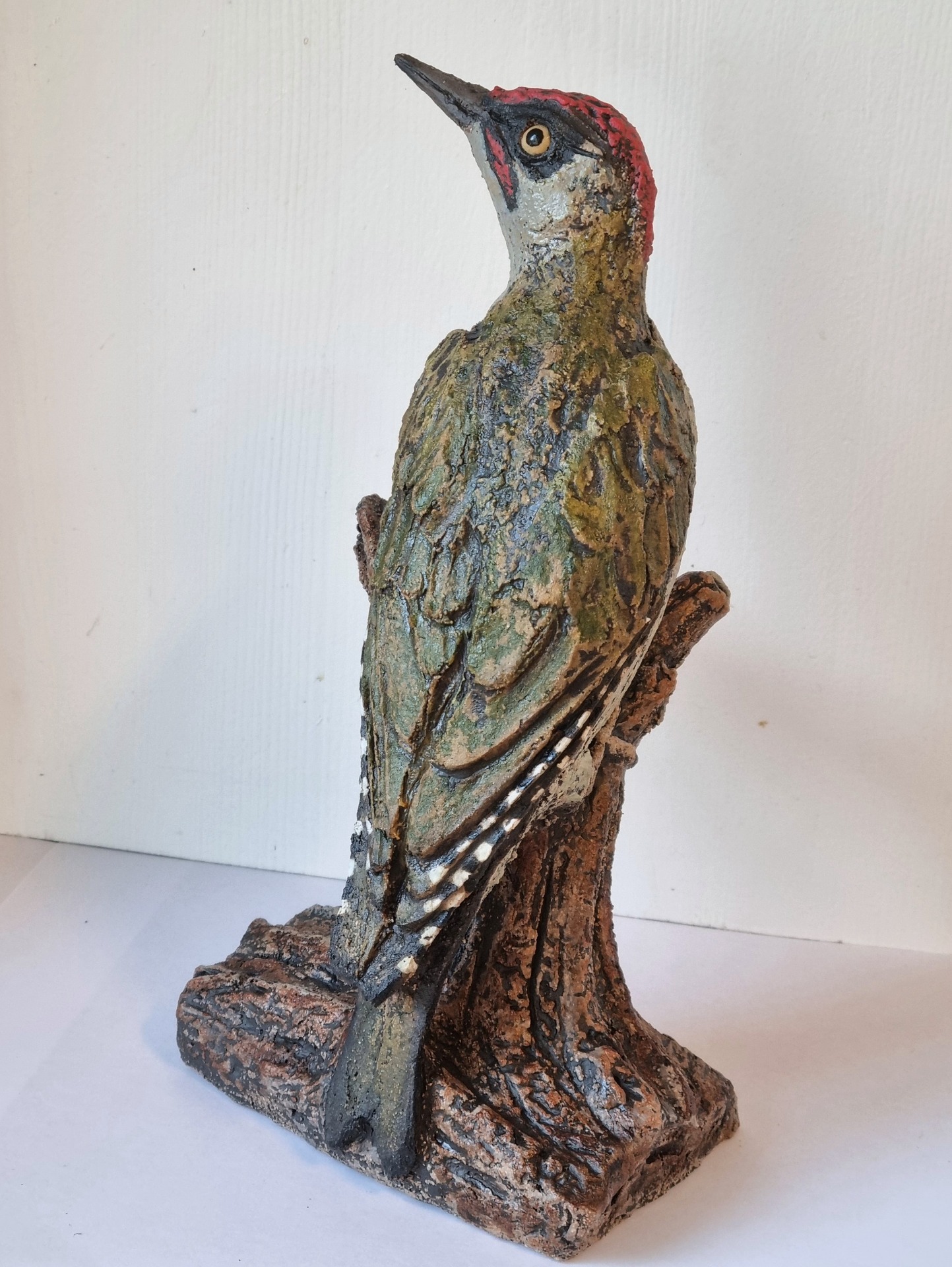 Grønnspett håndformet i grov keramikk. Høyde 25 cm, Bredde 17cm