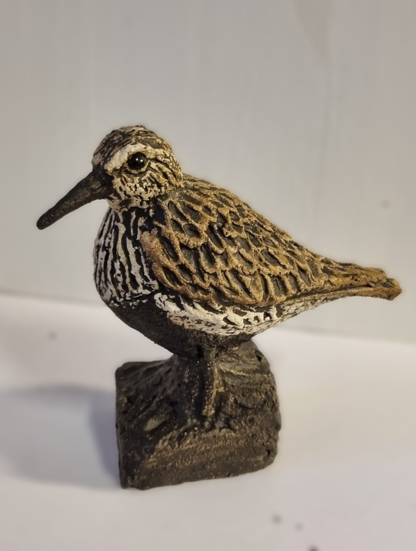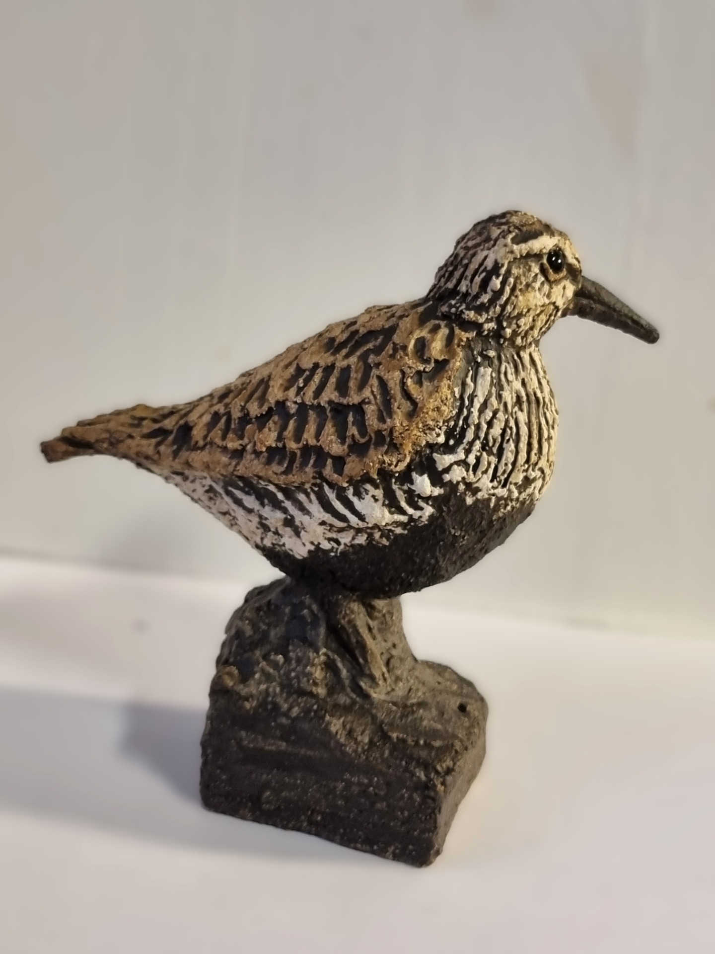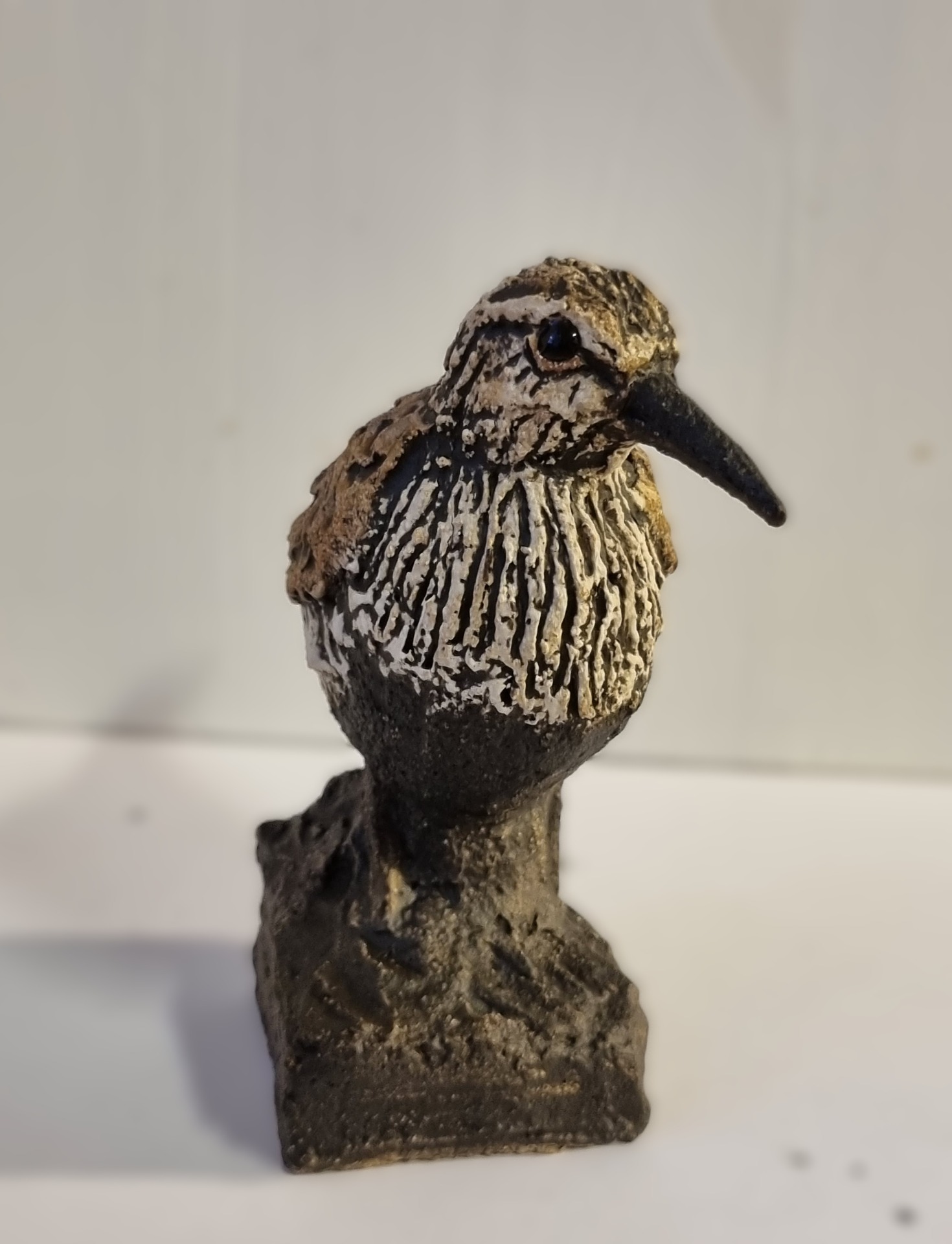 Håndlaget i grov keramikk. Høyde 12cm, lengde 13 cm, bredde 5 cm.
