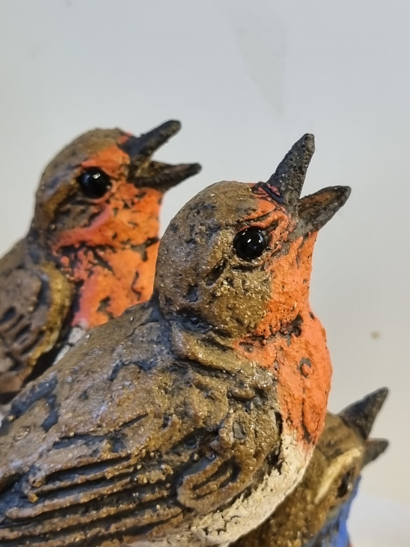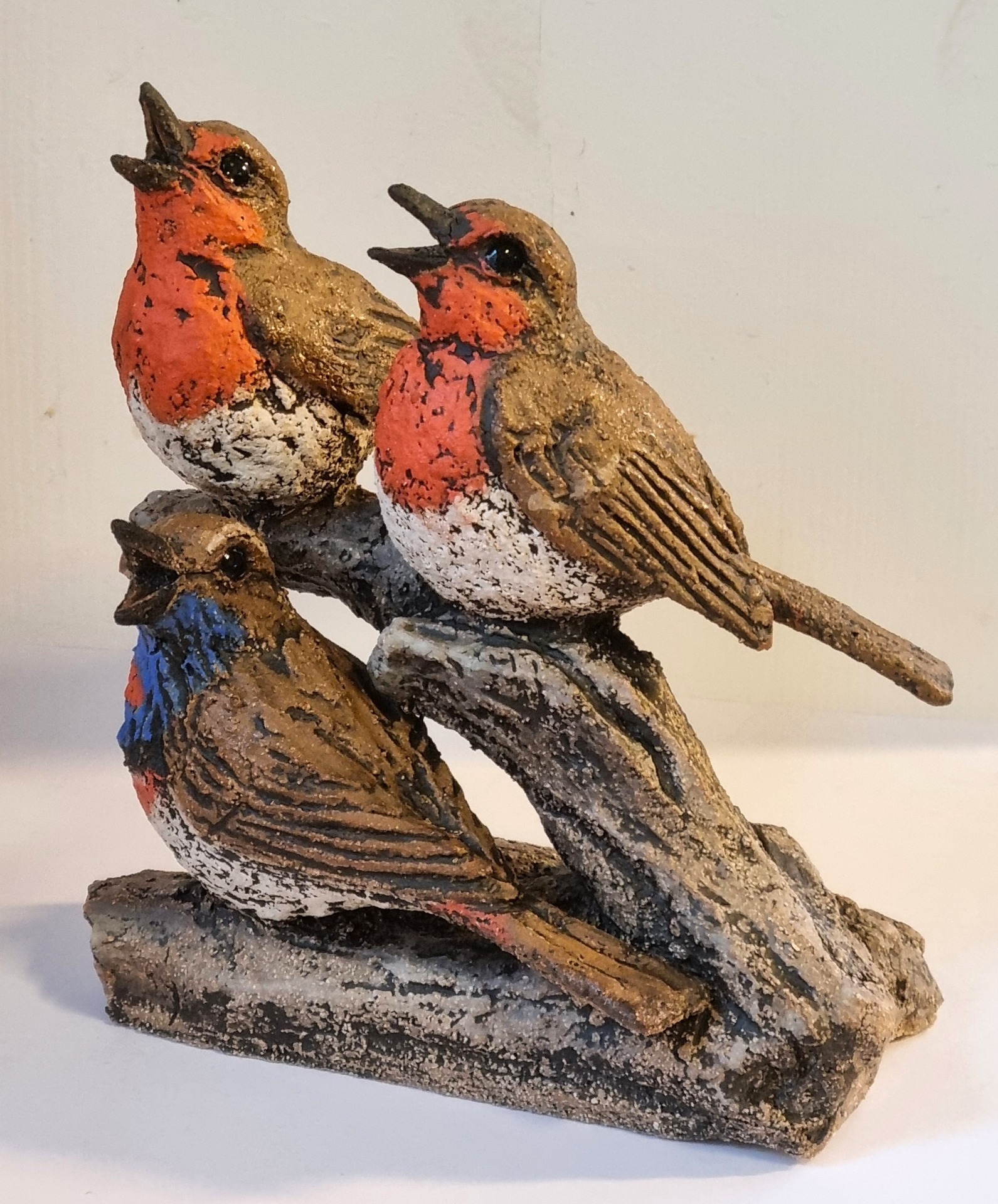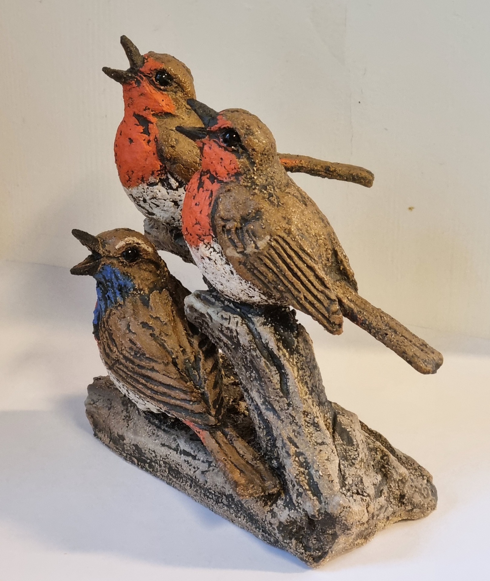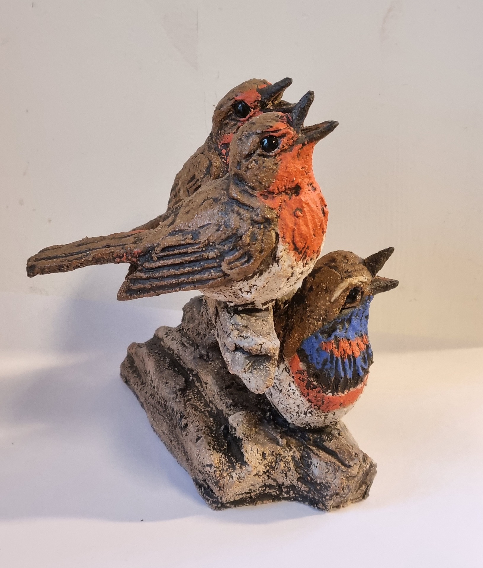 Fugler formet for hånd i grov leire. Høyde 15 cm, lengde 14 cm, bredde 13 cm.