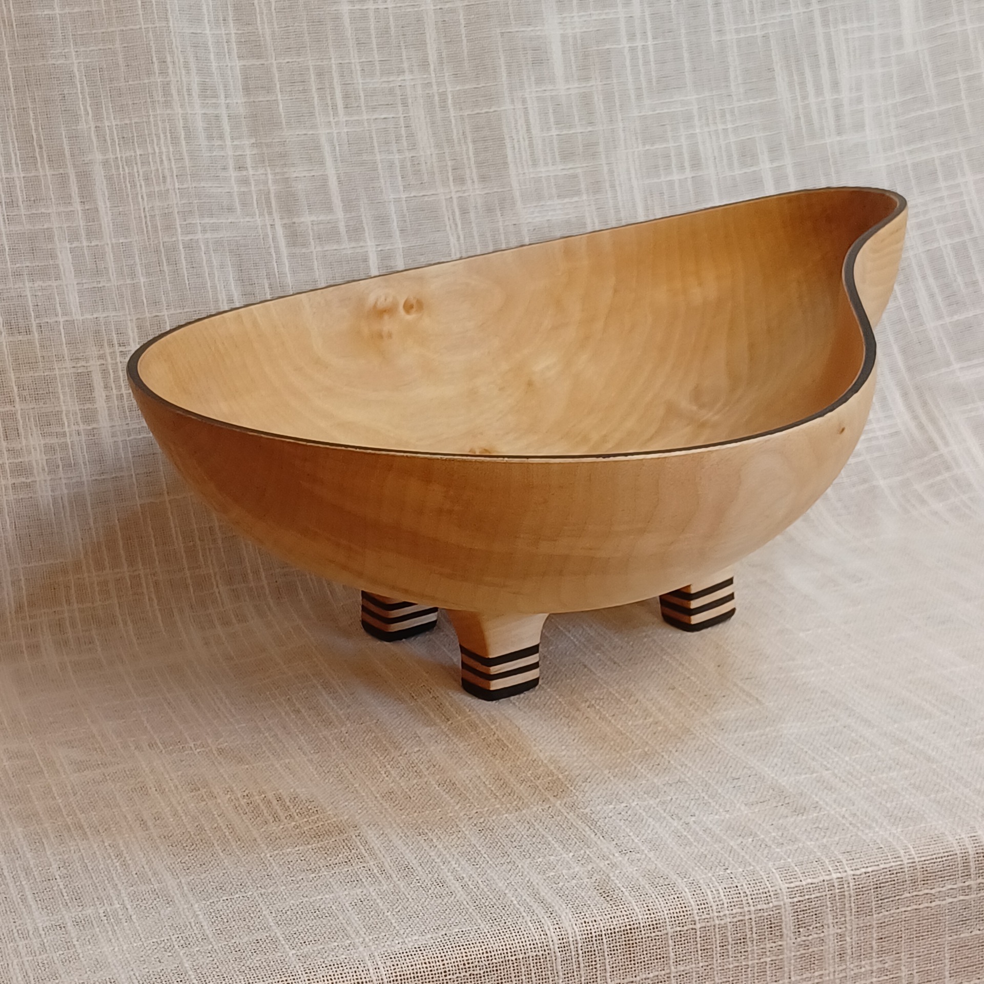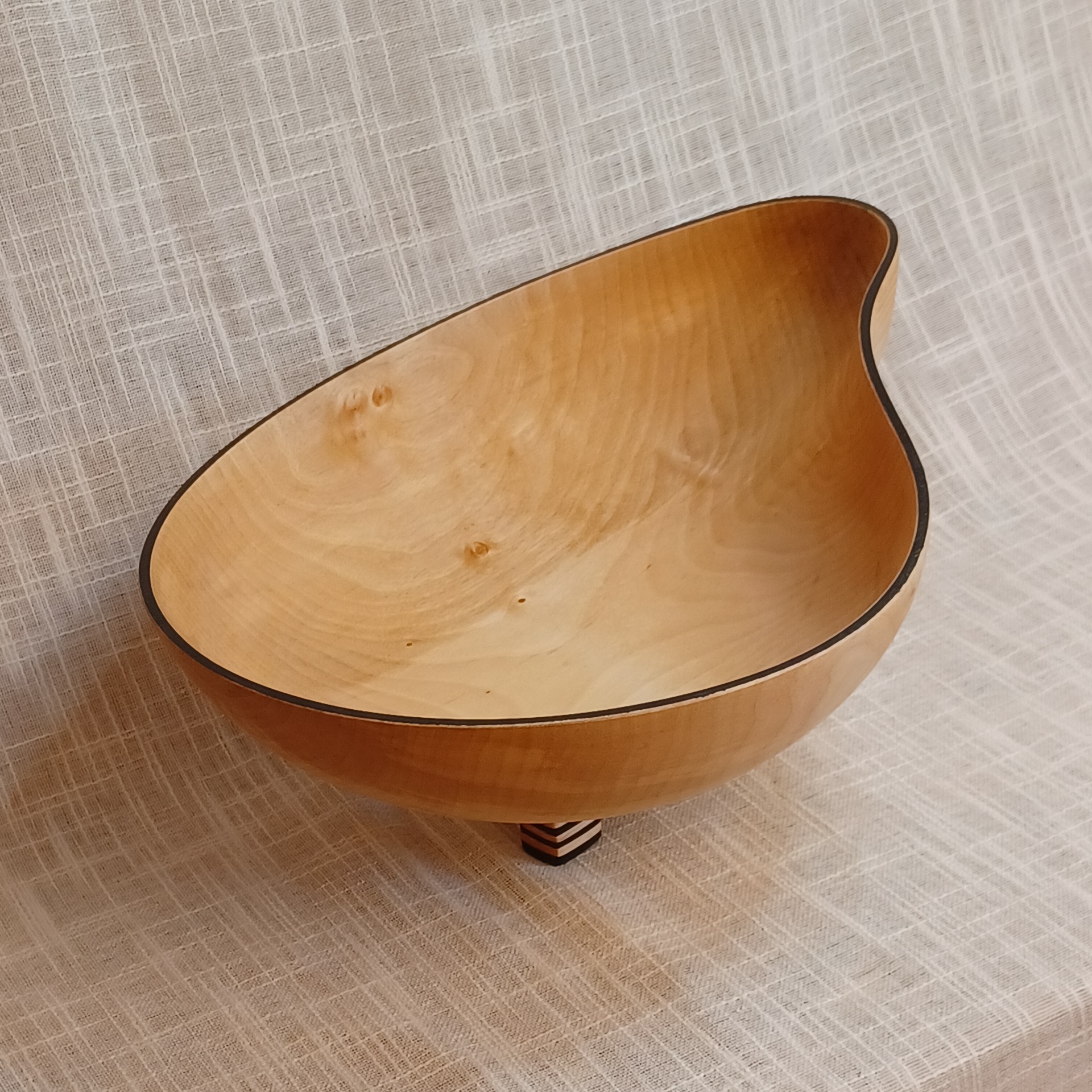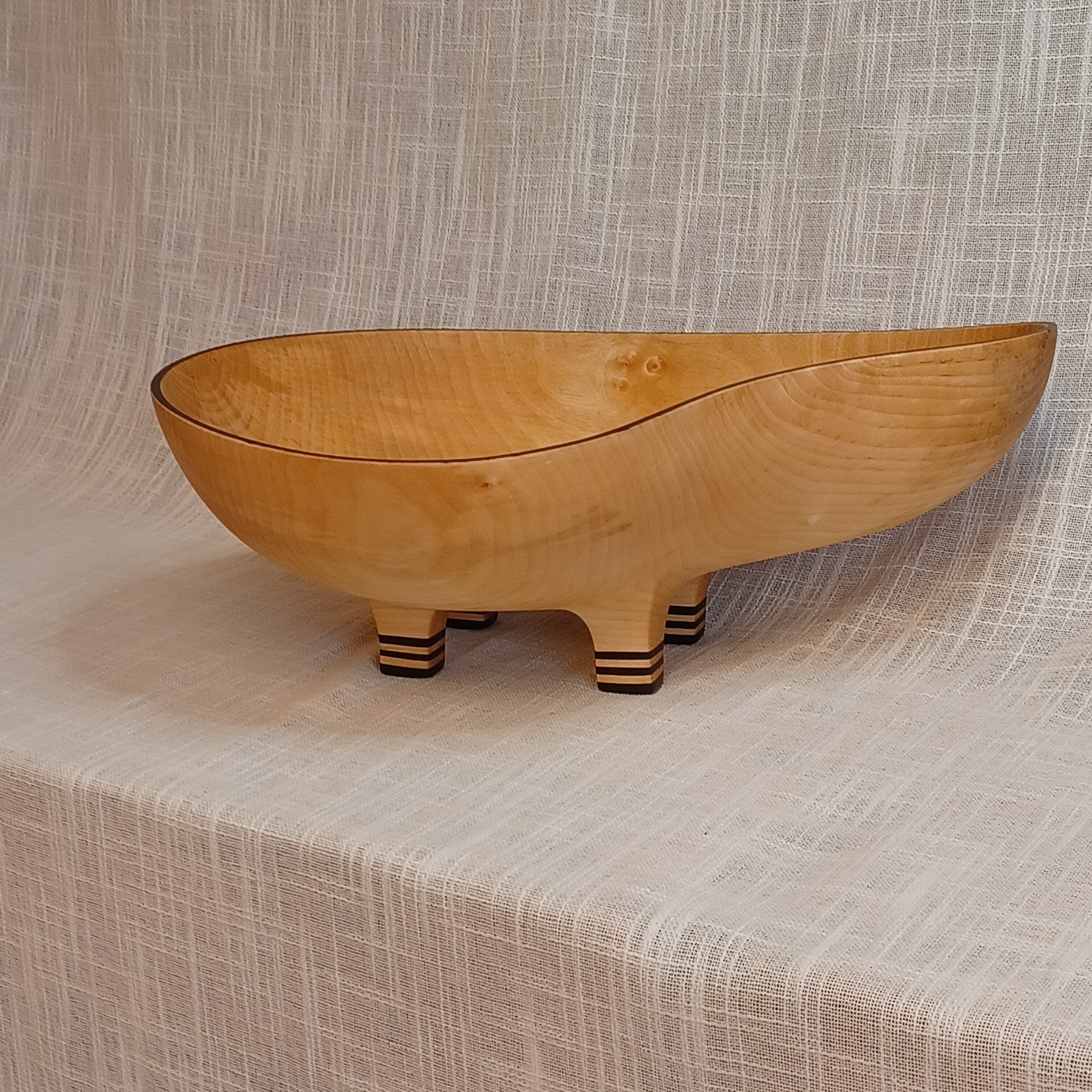Fatet er laget av bjørk og egner seg godt til frukt og annet snacks. De er bearbeidet for hånd. Uthult, pusset og oljet. Lengde 38 cm, høyde 14 cm og bredde 26 cm.