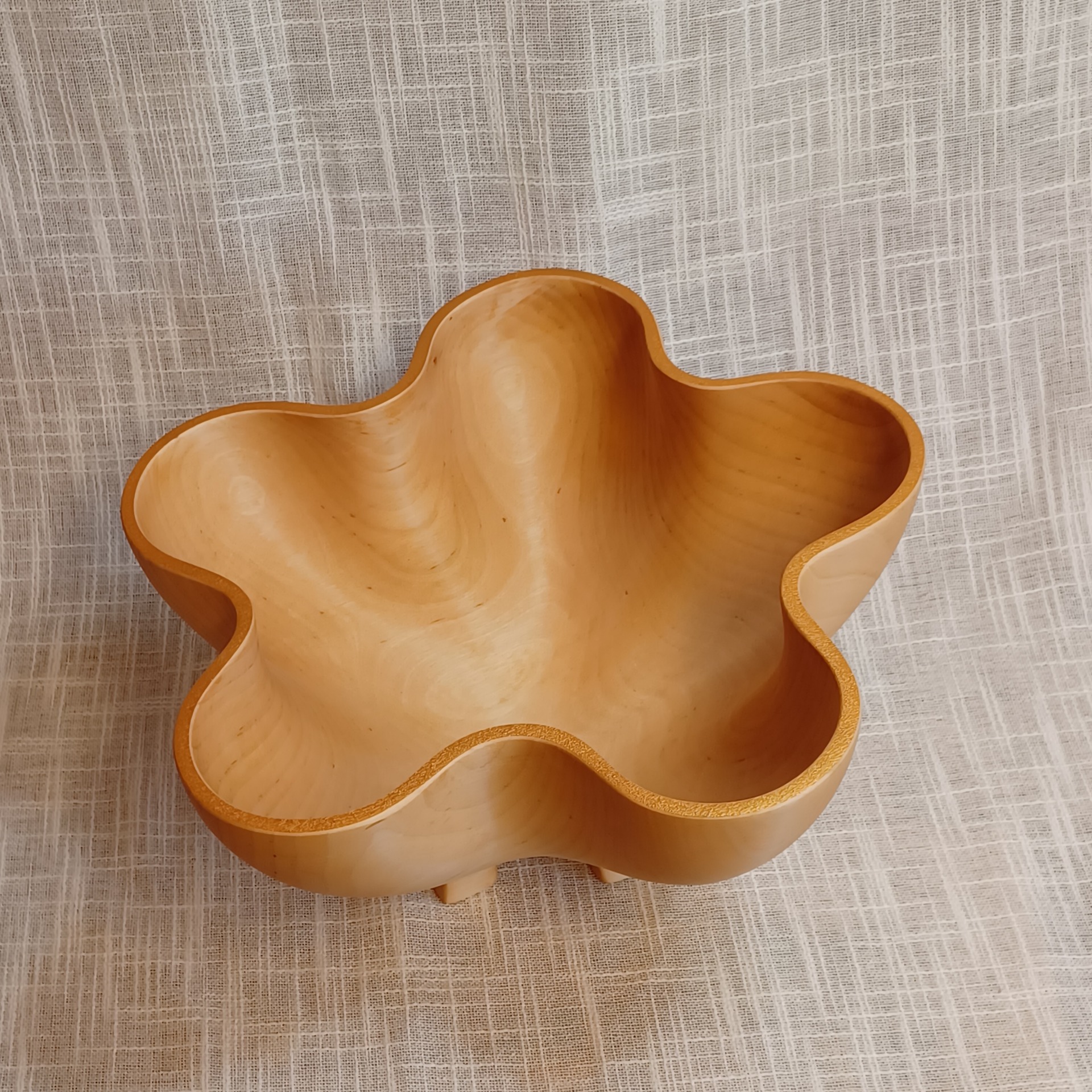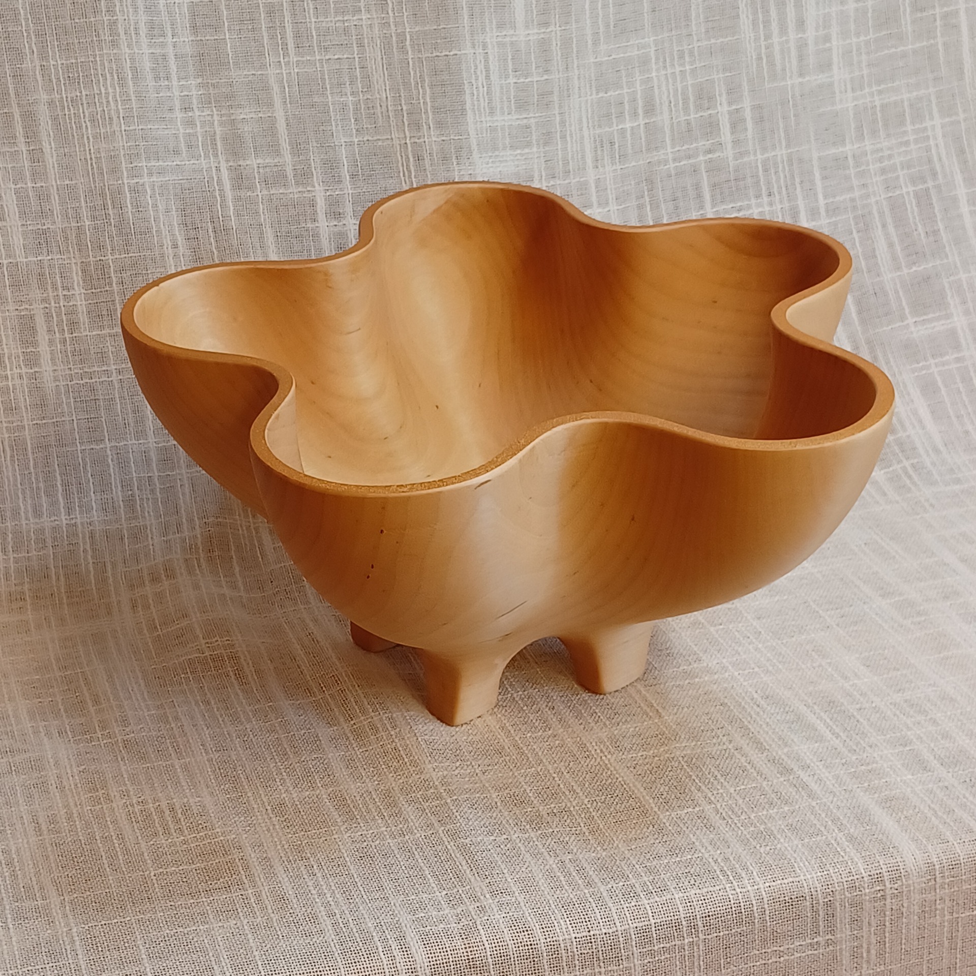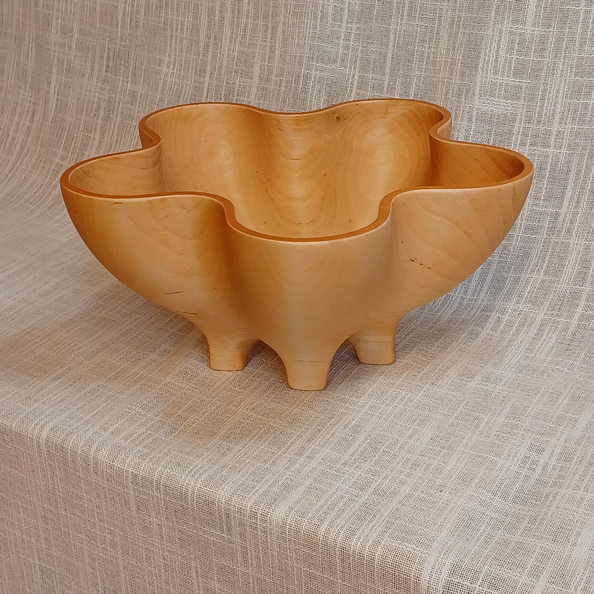 Fatet er laget av bjørk og egner seg godt til frukt og annet snacks. De er bearbeidet for hånd. Uthult, pusset og oljet. Lengde 28 cm, høyde 14 cm og bredde 26 cm.