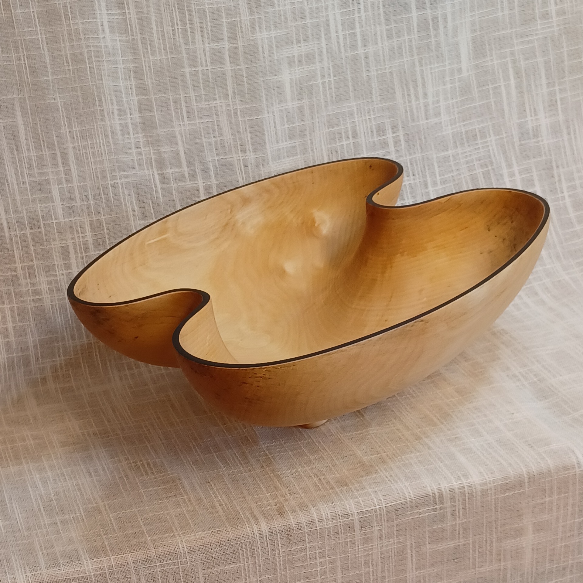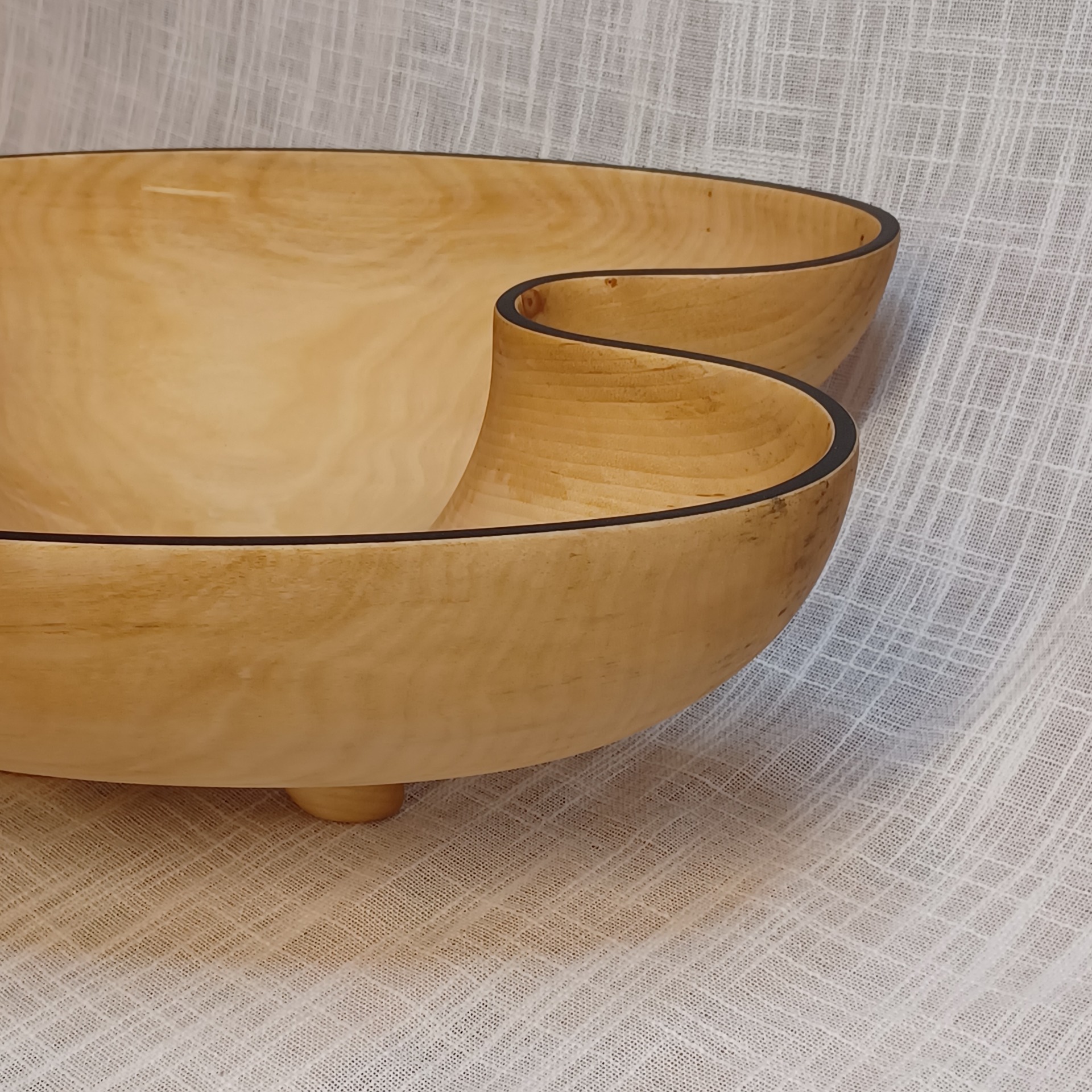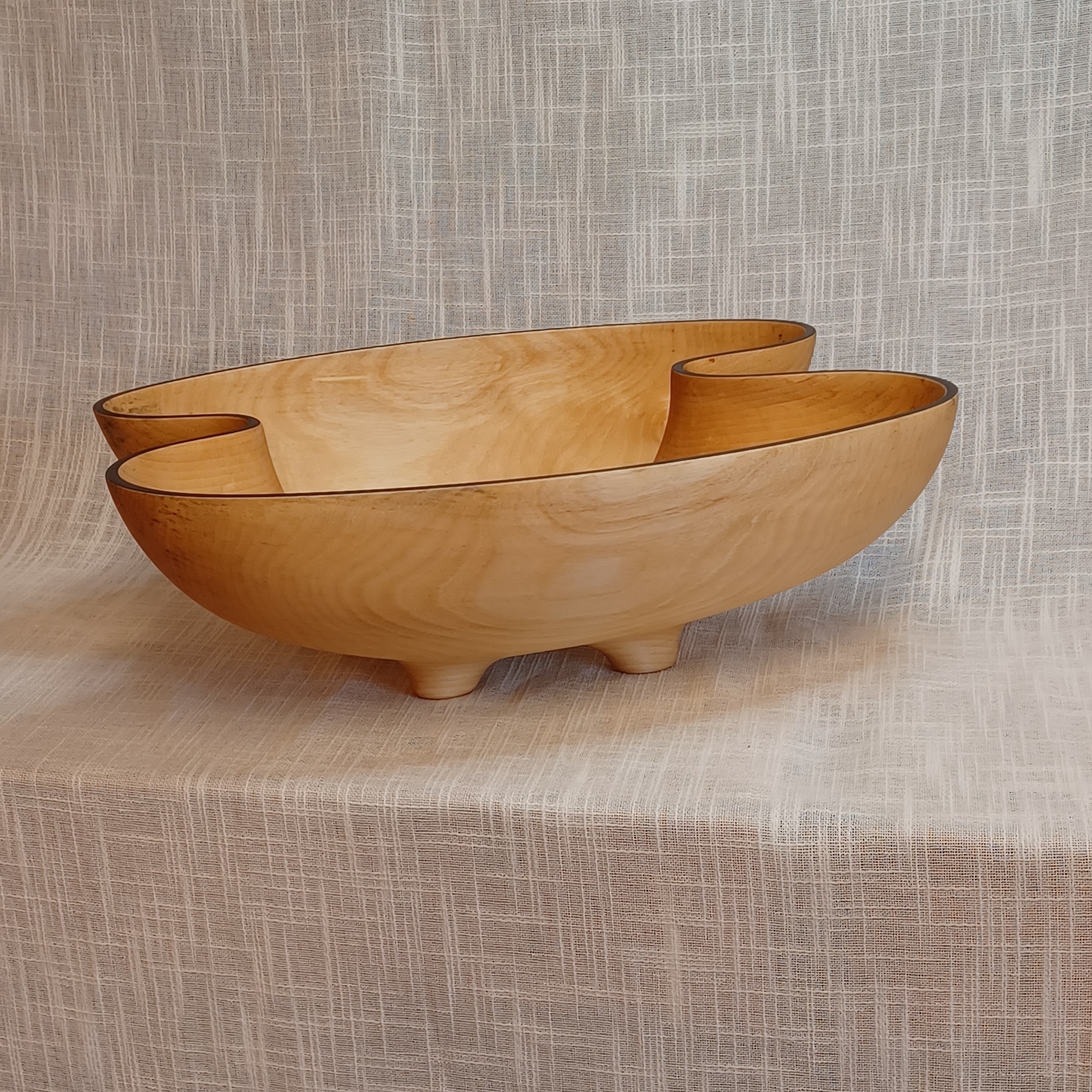 Fatet er laget av bjørk og egner seg godt til frukt og annet snacks. De er bearbeidet for hånd. Uthult, pusset og oljet. Lengde 39 cm, høyde 13 cm og bredde 29 cm.