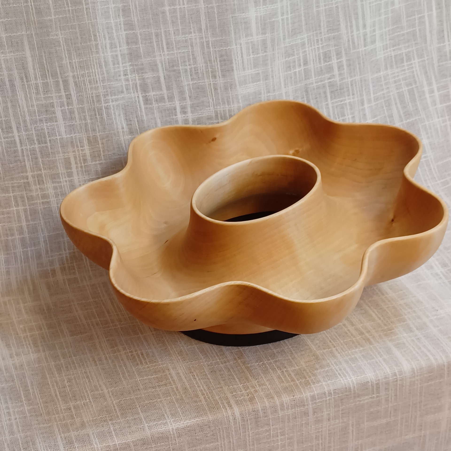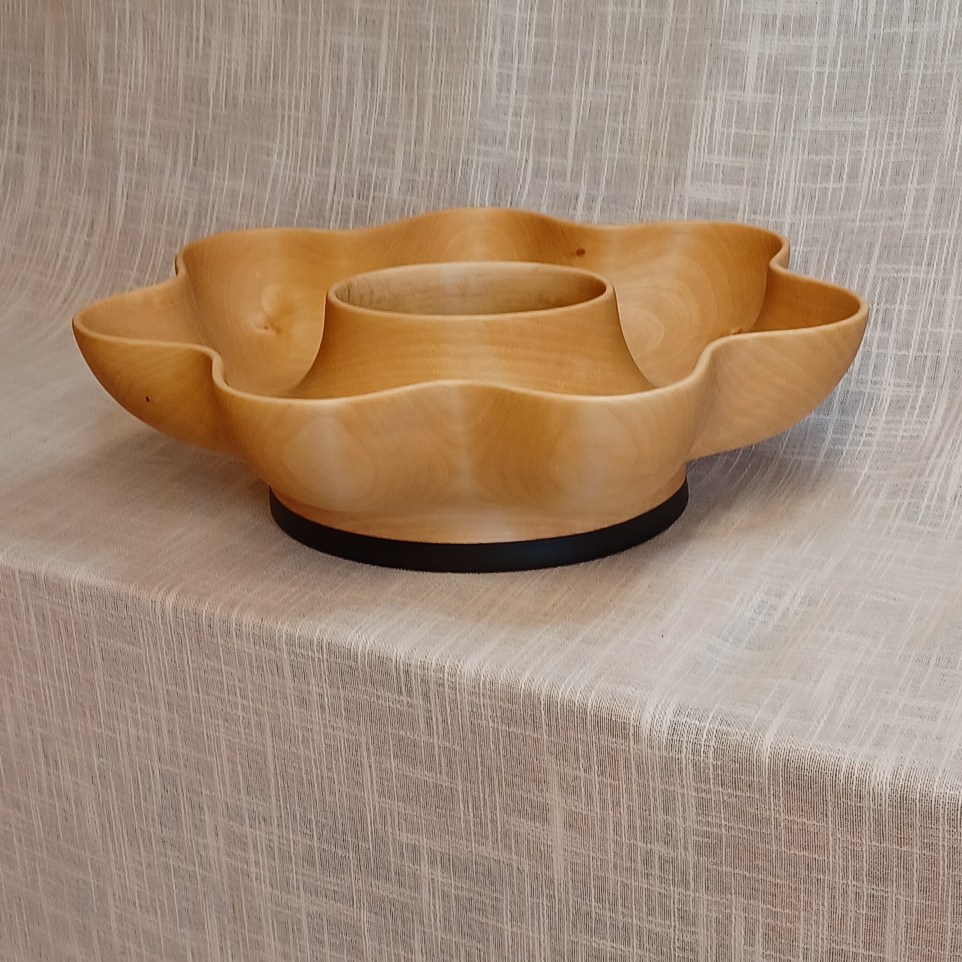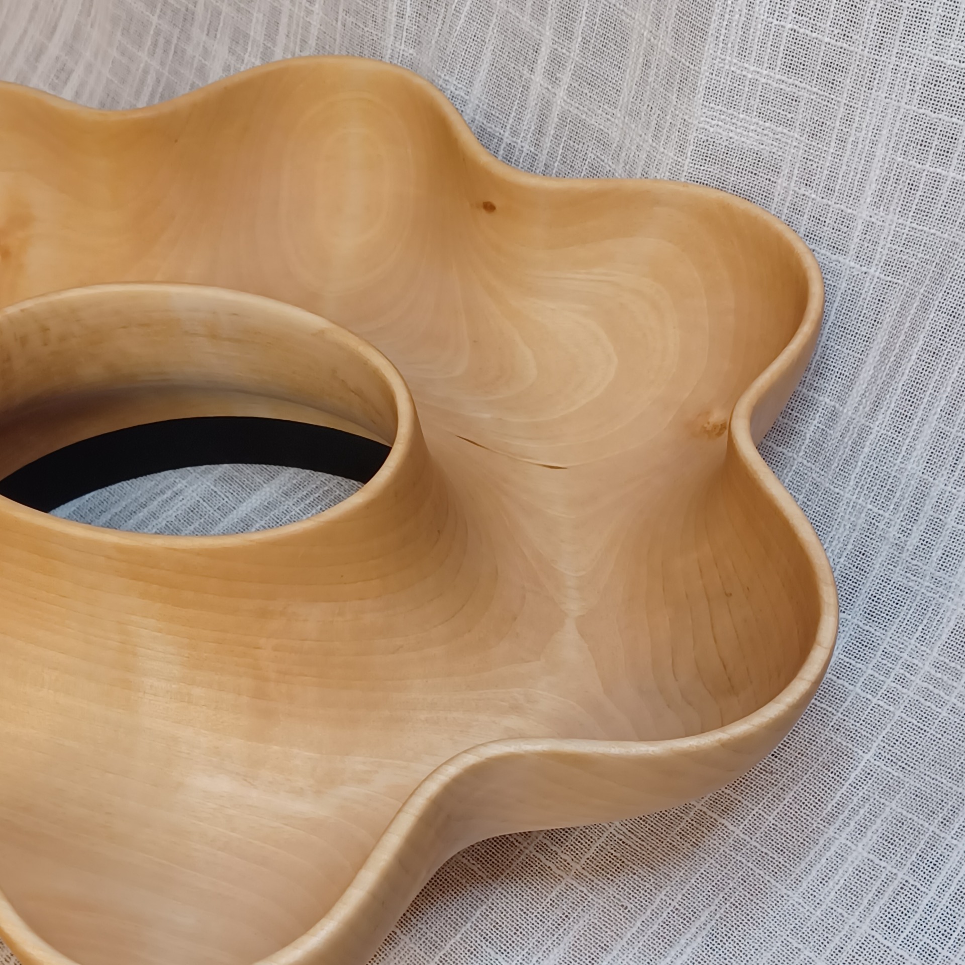 r laget av bjørk og egner seg godt til frukt og annet snacks. De er bearbeidet for hånd. Uthult, pusset og oljet. Lengde 39 cm, høyde 12 cm og bredde 34 cm.