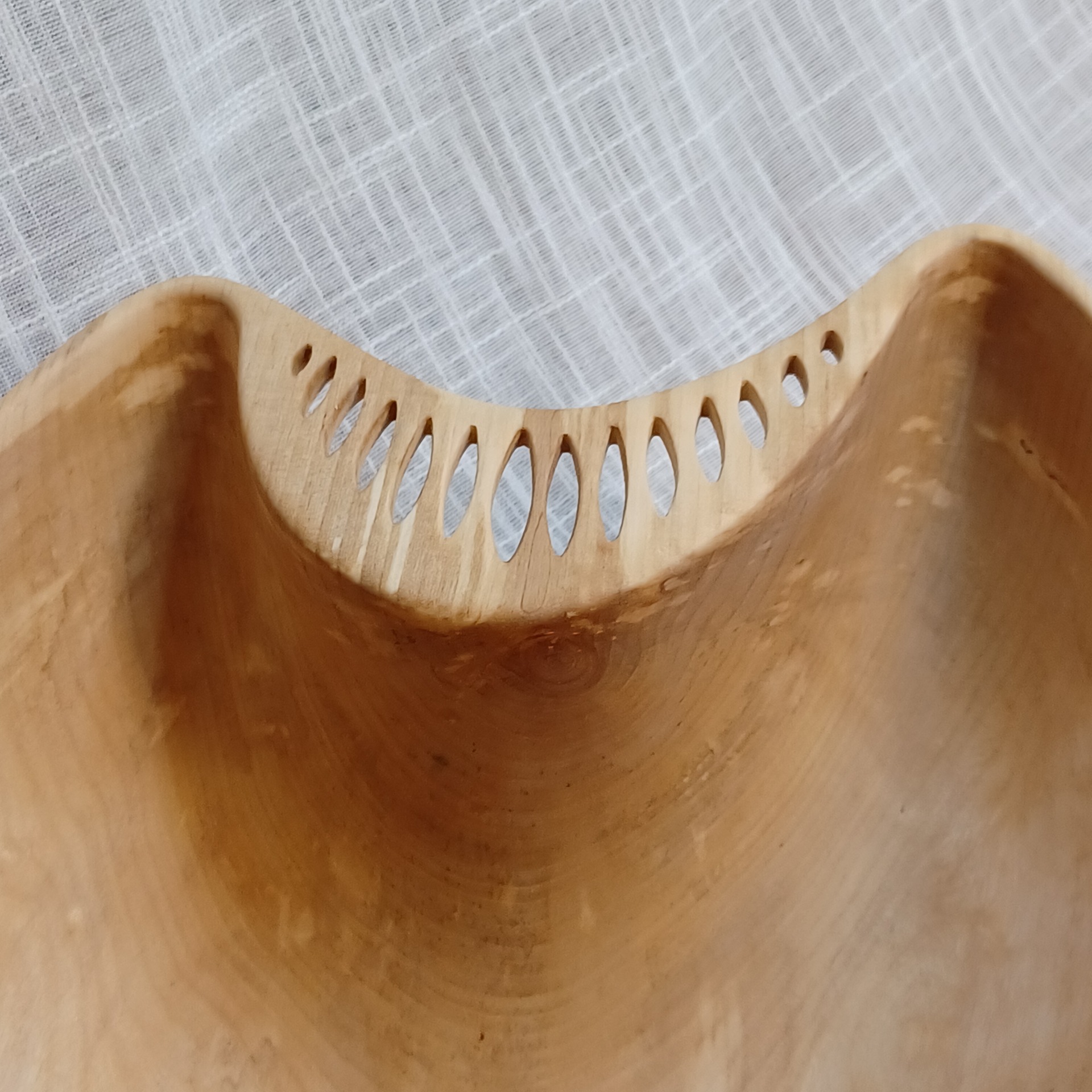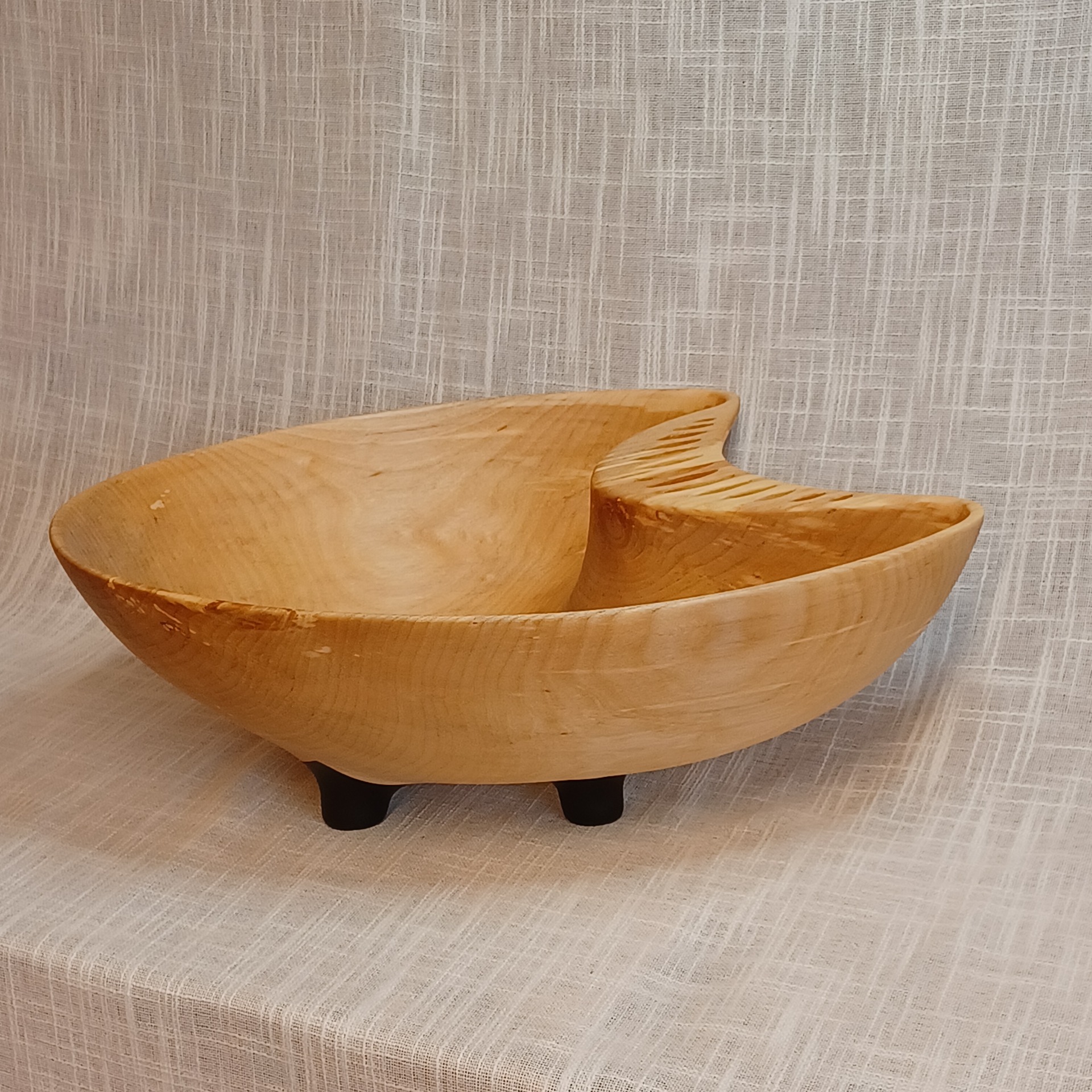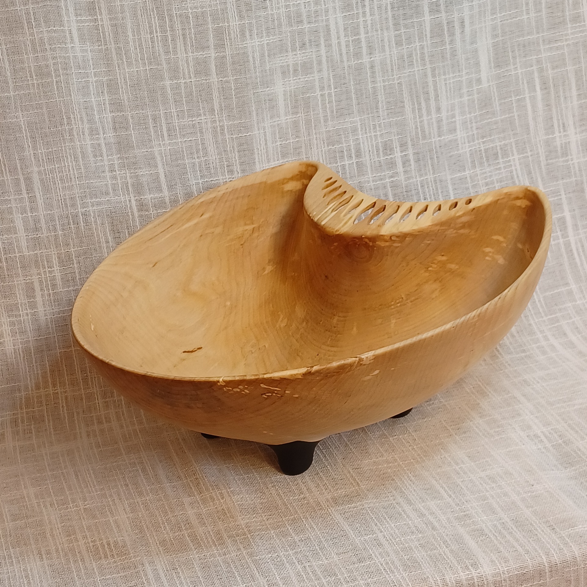 Fatet er laget av bjørk og egner seg godt til frukt og annet snacks. De er bearbeidet for hånd. Uthult, pusset og oljet. Lengde 40 cm, høyde 13 cm og bredde 29 cm.