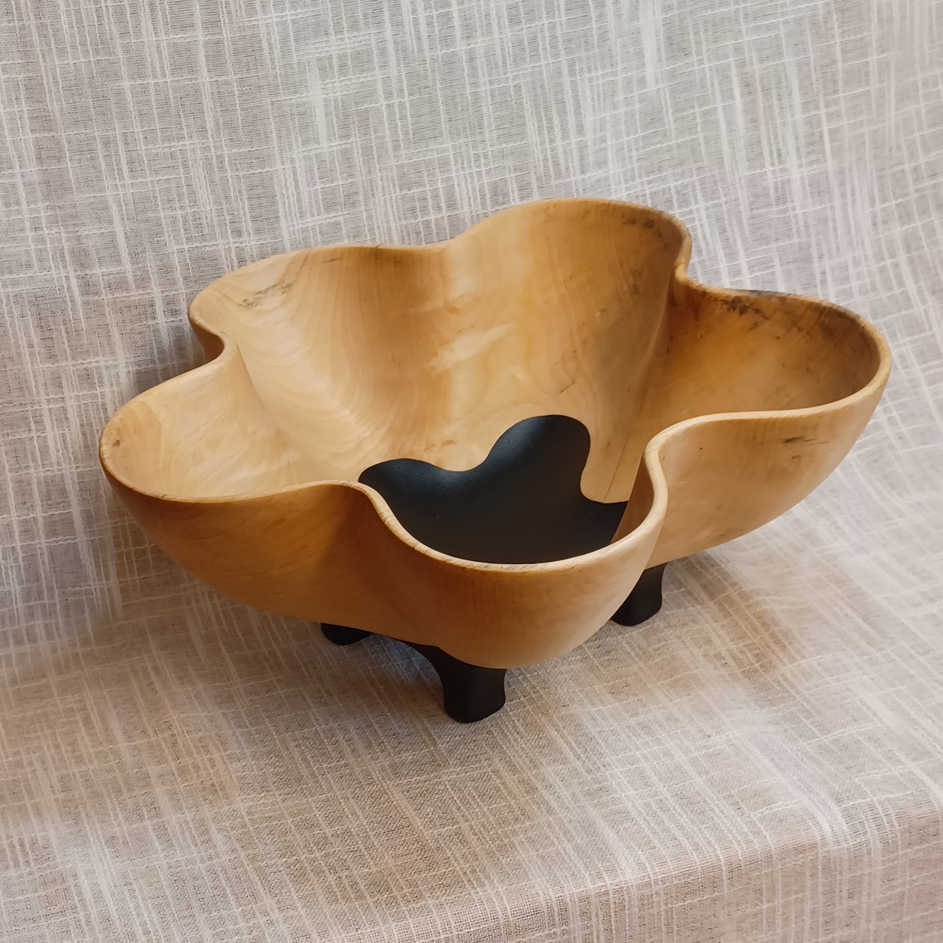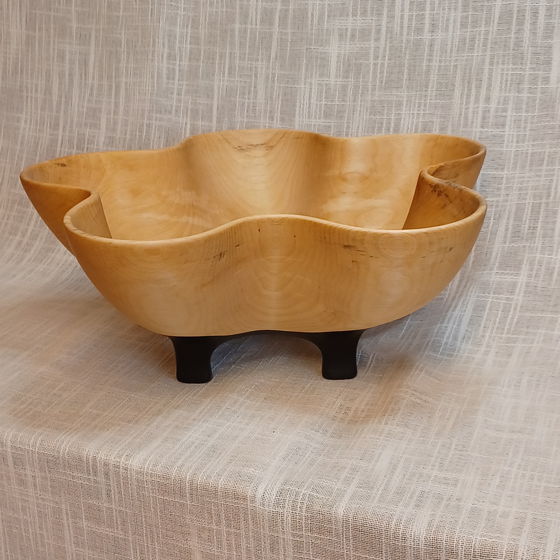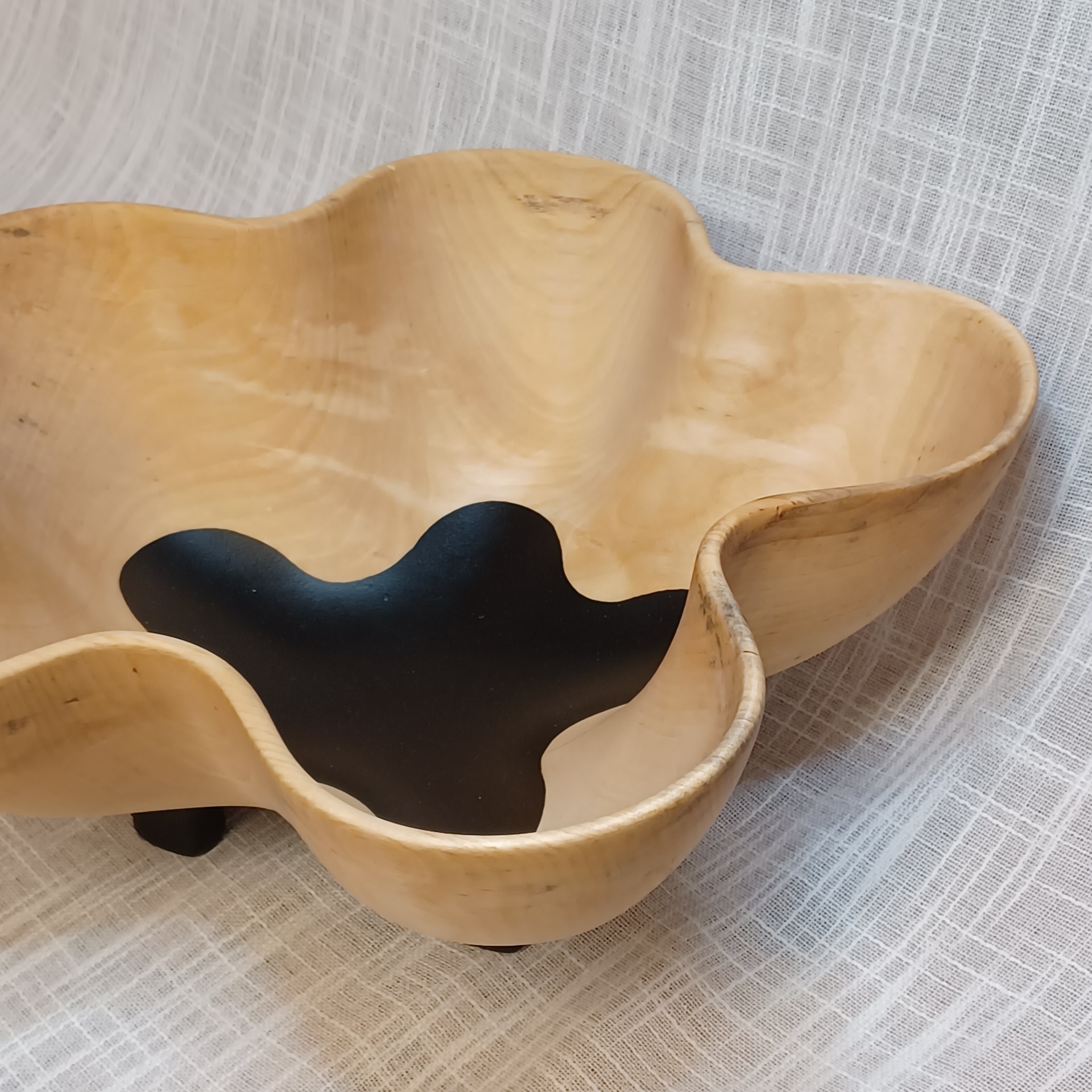 Fatet er laget av bjørk og egner seg godt til frukt og annet snacks. De er bearbeidet for hånd. Uthult, pusset og oljet. Lengde 36 cm, høyde 15 cm og bredde 31 cm.
