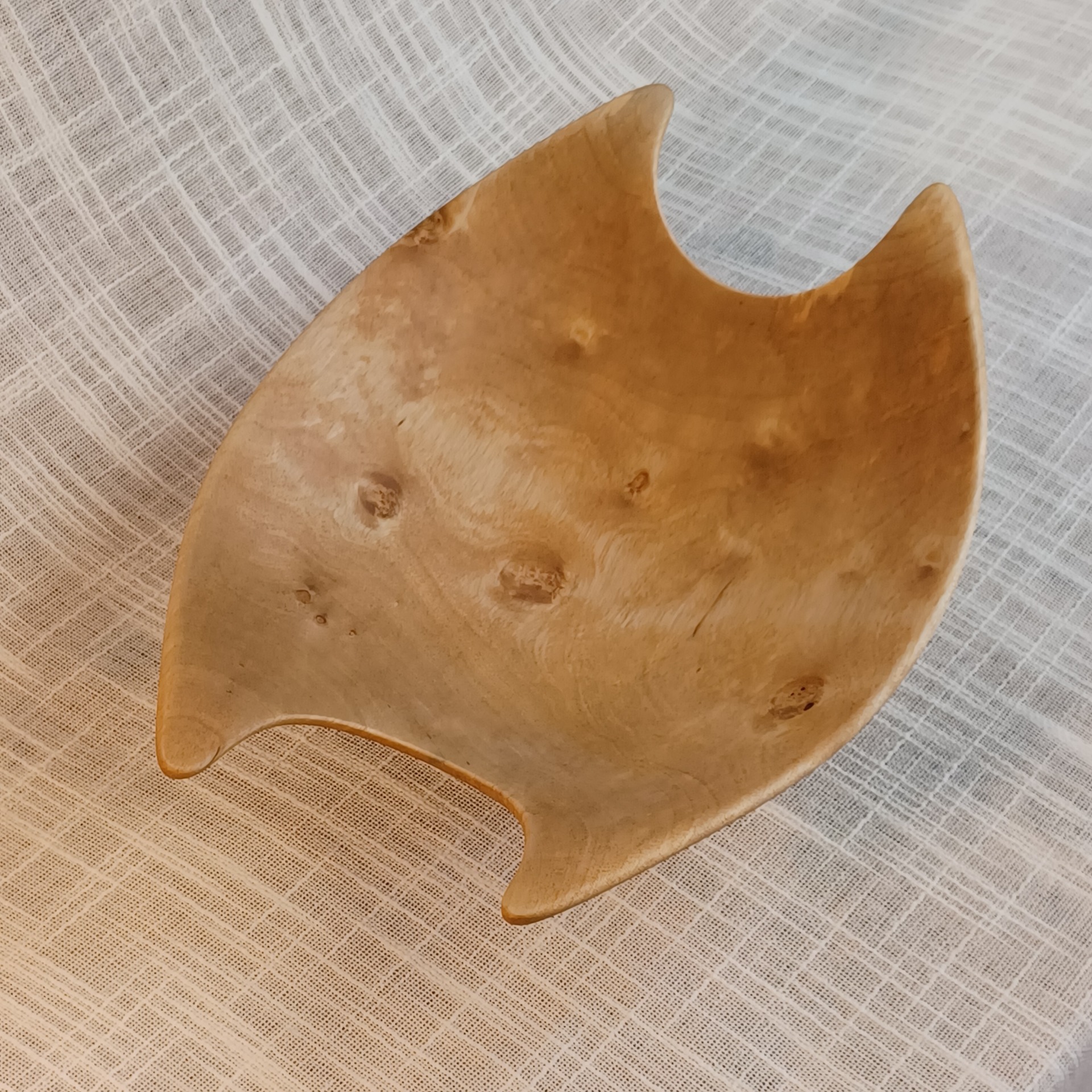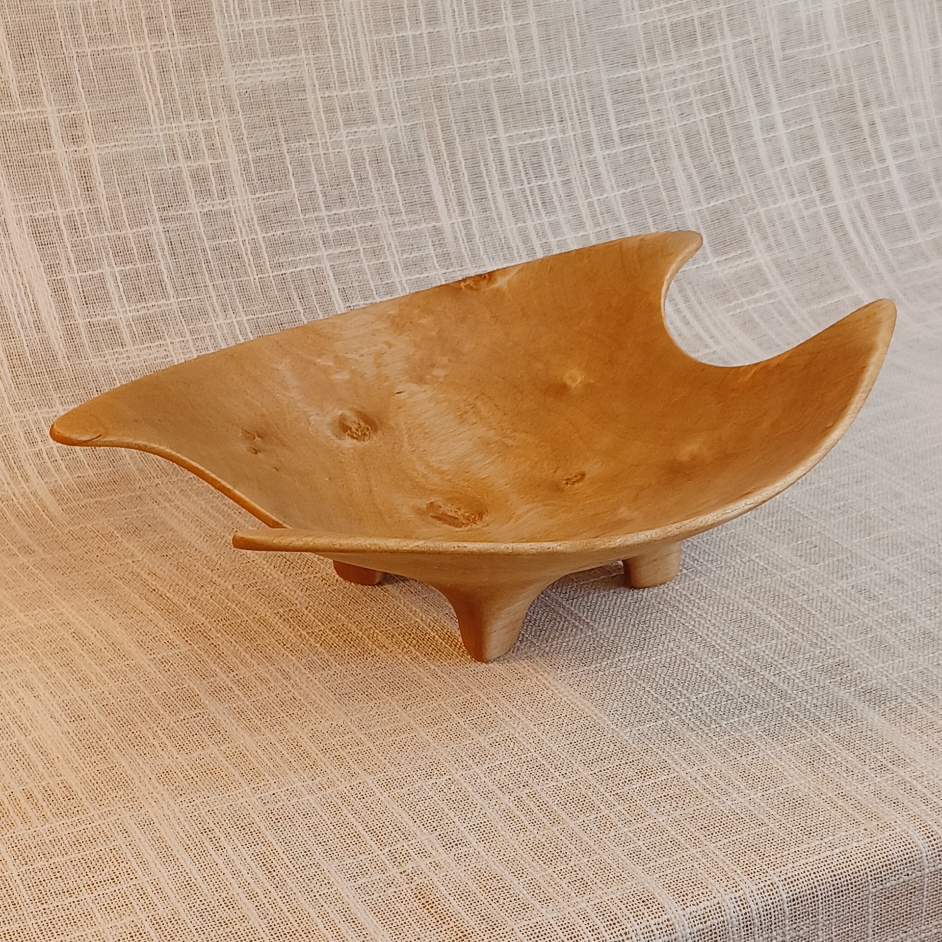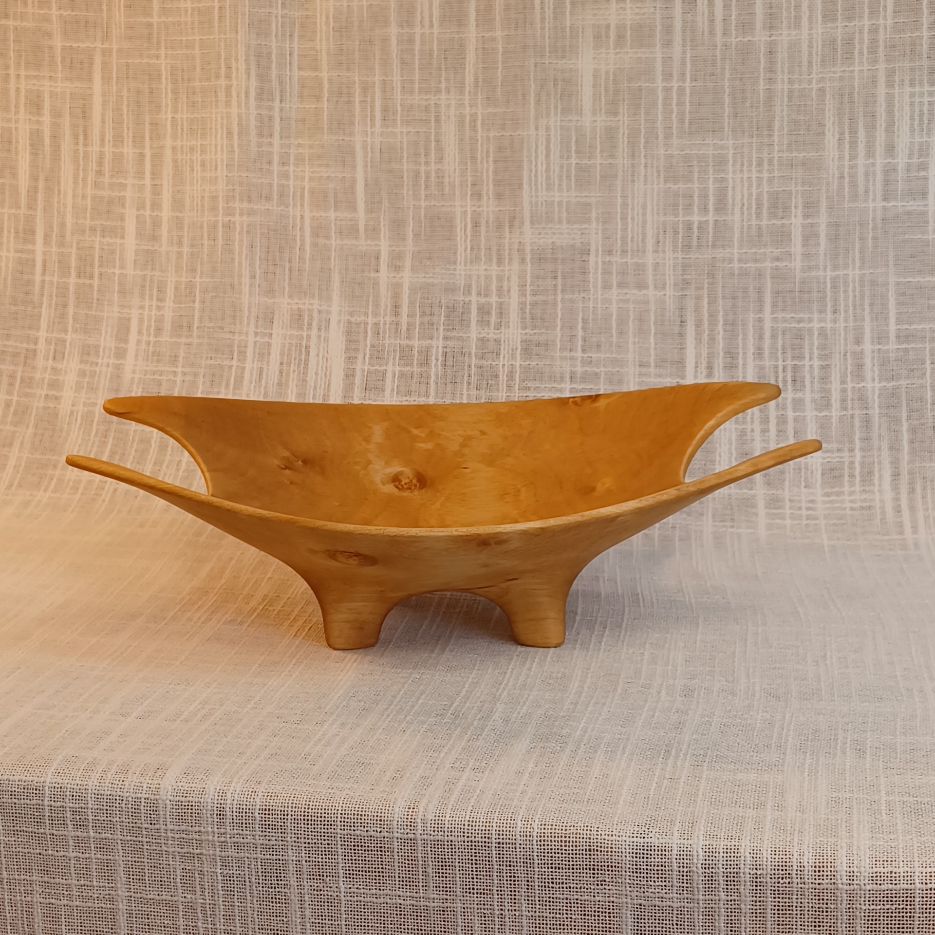 Fatet er laget av bjørk og egner seg godt til godteri. Det er bearbeidet for hånd. Uthult, pusset og oljet. Lengde 27 cm, høyde 8 cm og bredde 20 cm.
