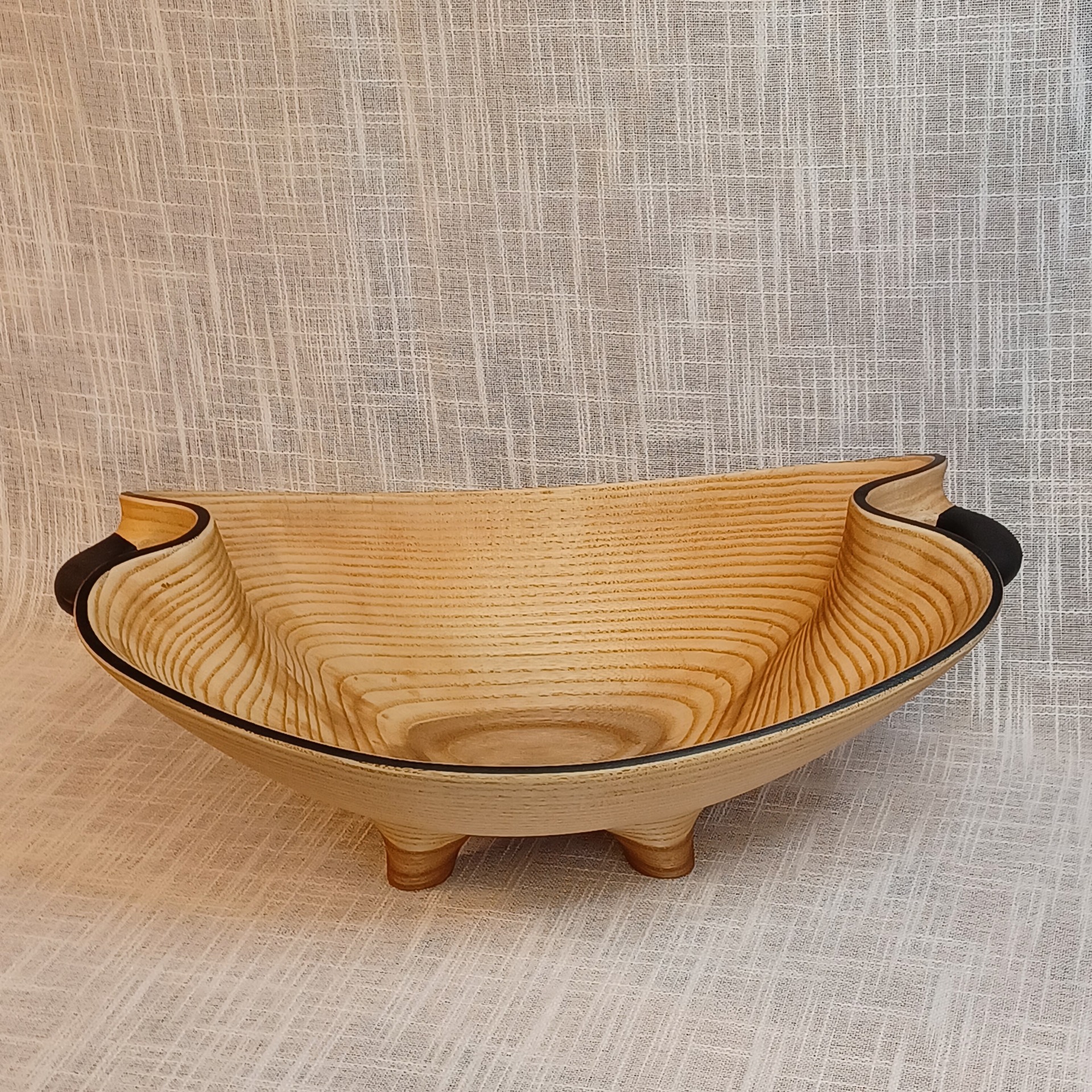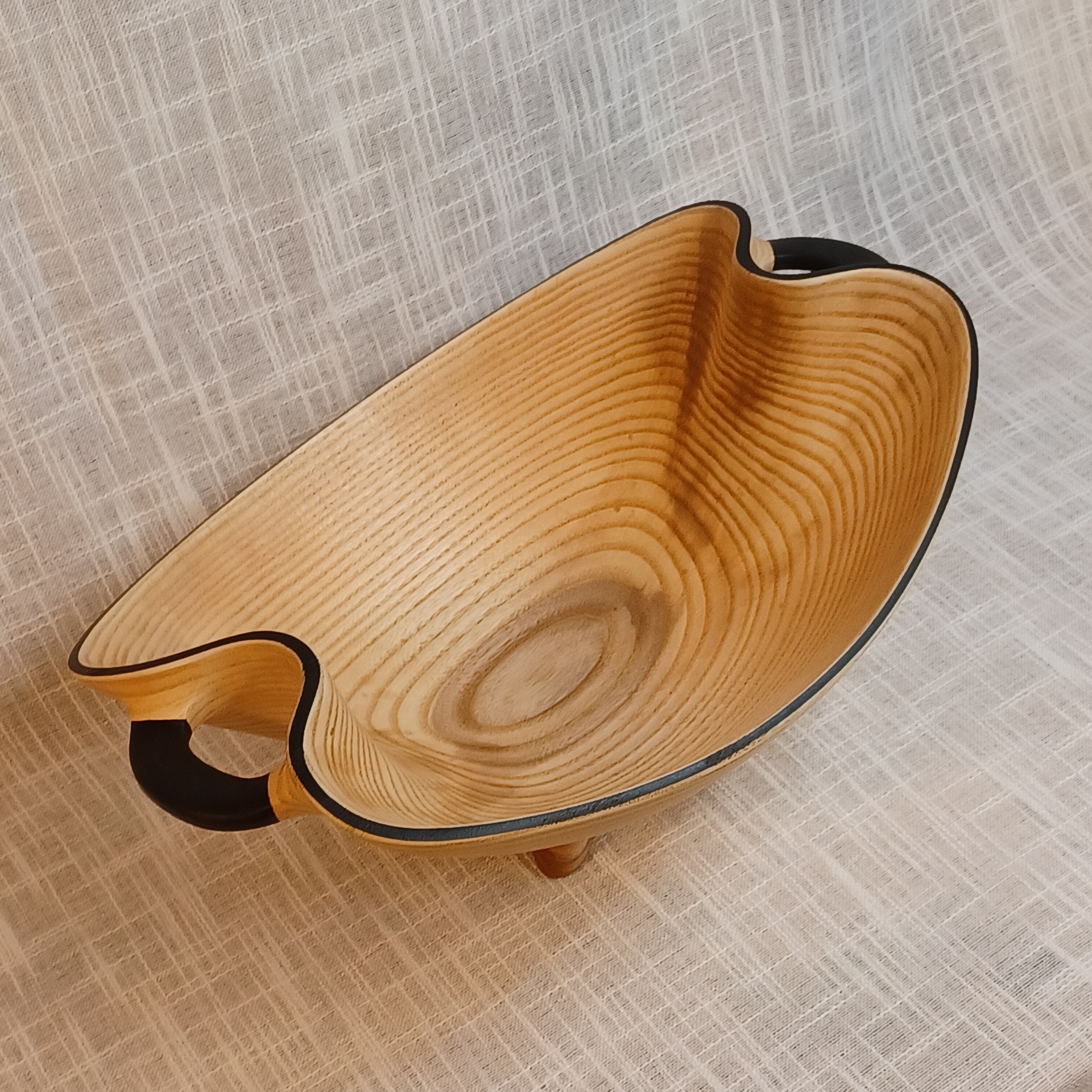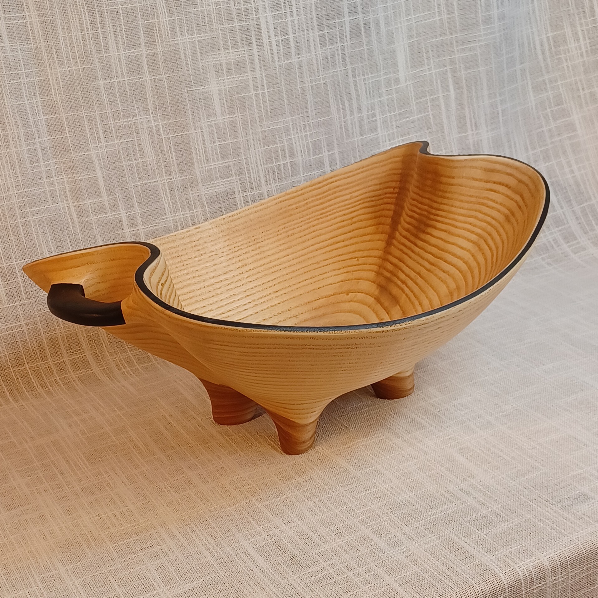 Fatet er laget av ask og egner seg godt til frukt. Det er bearbeidet for hånd. Uthult, pusset og oljet. Lengde 42 cm, høyde 27 cm og bredde 16 cm.
